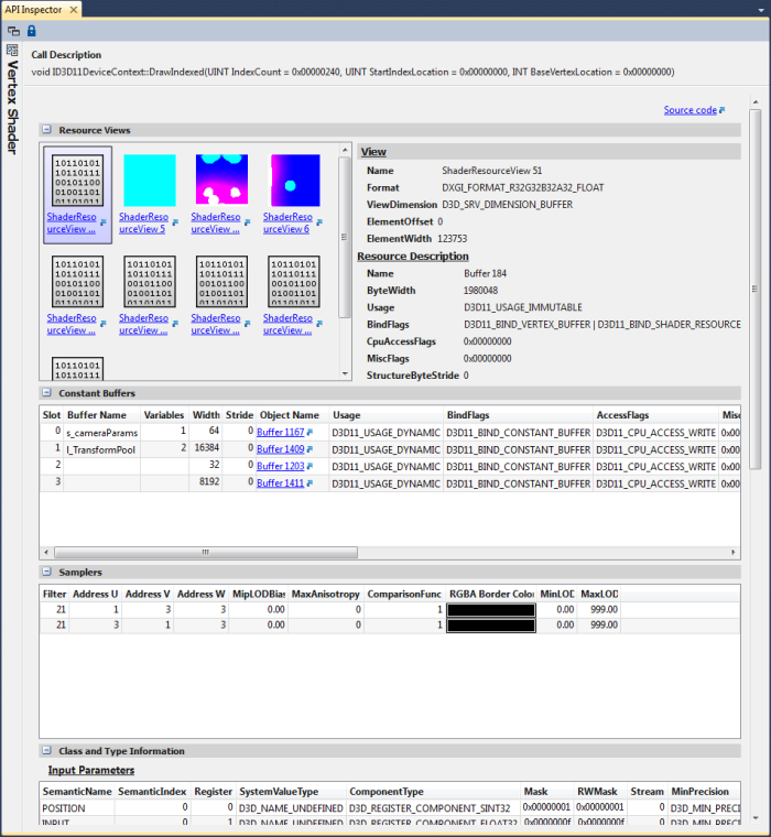 The various shader pages display all of the constant buffers, shader resource views, and input/output parameters, as well as links to the HLSL source code and other shader information.