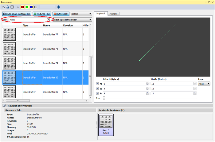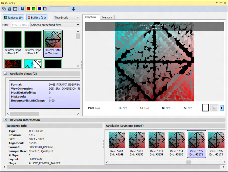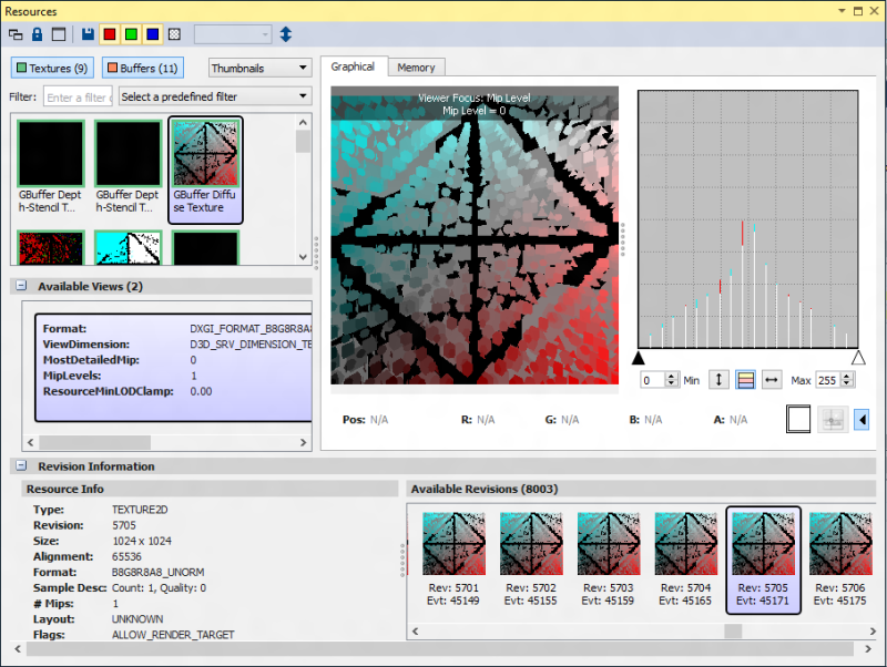 The Graphical tab allows you to inspect the resource, pan using the left mouse button to click and drag, zoom using the mouse wheel, and inspect pixel values. Also, this is where you can save the resource to disk. If supported on your GPU and API, this is also where you can initiate a Pixel History session to get all of the contributing fragments for a given pixel.