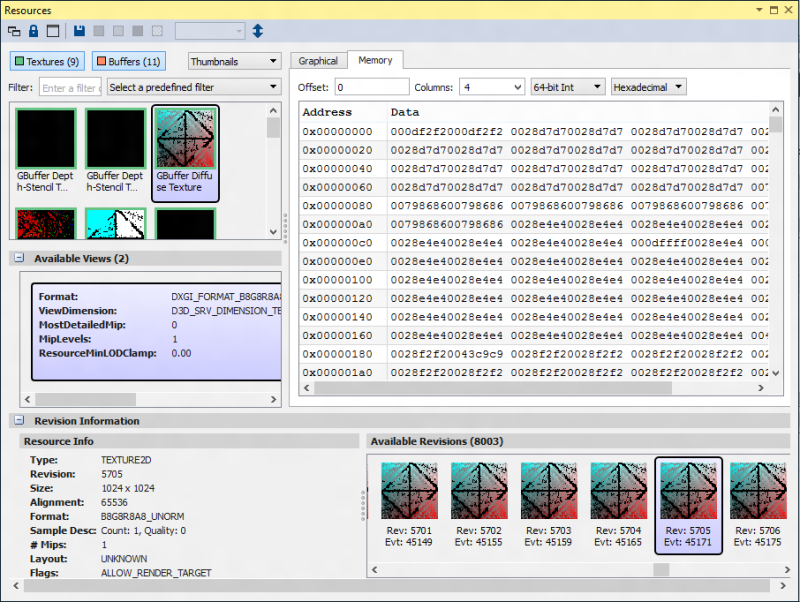The Memory tab shows a binary dump of the resource data. You can use the controls at the top to cast the values to different data types and decide how many columns to display.