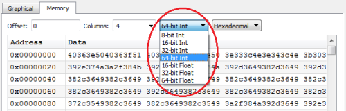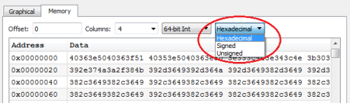 The second drop-down is a further modifier for the integer formats — you can choose hexadecimal, signed, or unsigned formats. Note that if you select to display floating point data, this drop-down menu will be disabled.