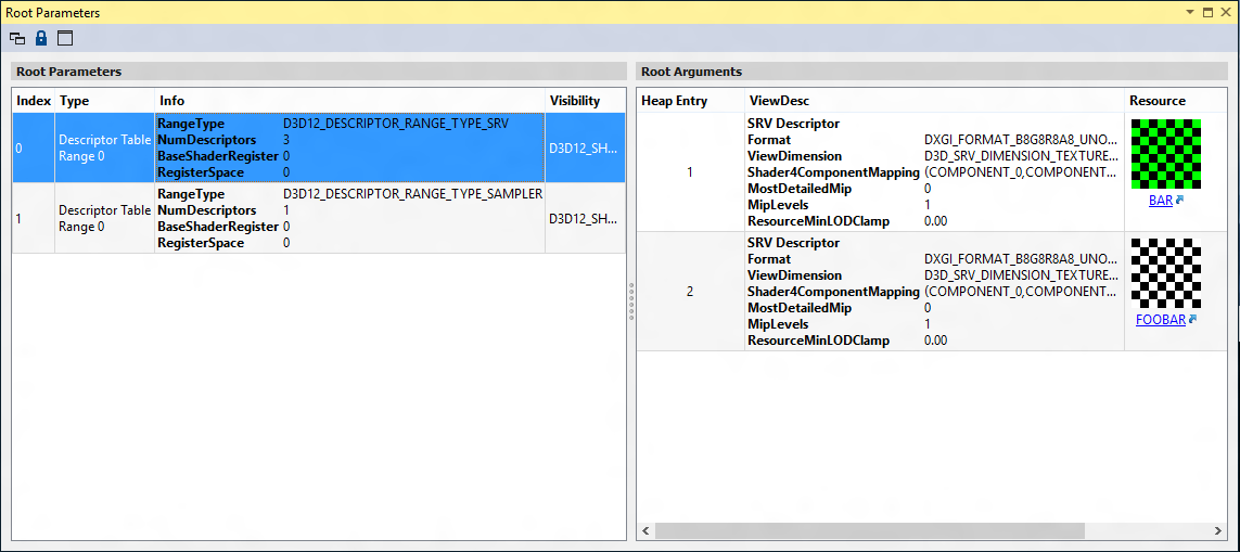 When you select a root parameter on the left, the root arguments for that parameter are displayed on the right. This shows residency information, any invalid descriptors are displayed in red. Using root parameters as a diagnostic tool can help prevent a GPU fault.