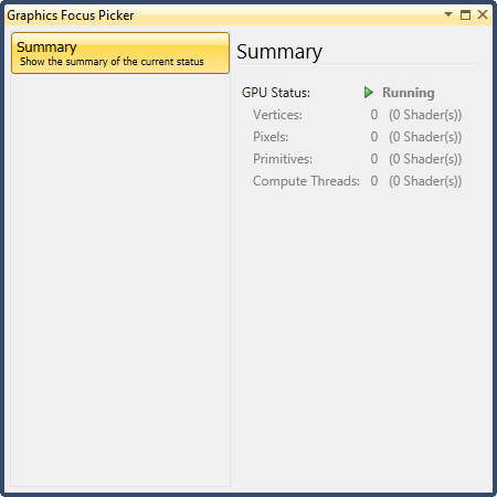 The Graphics Focus Picker window displays which shader has focus. The information that you see in Visual Studio corresponds to the shader that has focus. The execution of the target application must be paused in order to see information about a specific shader.