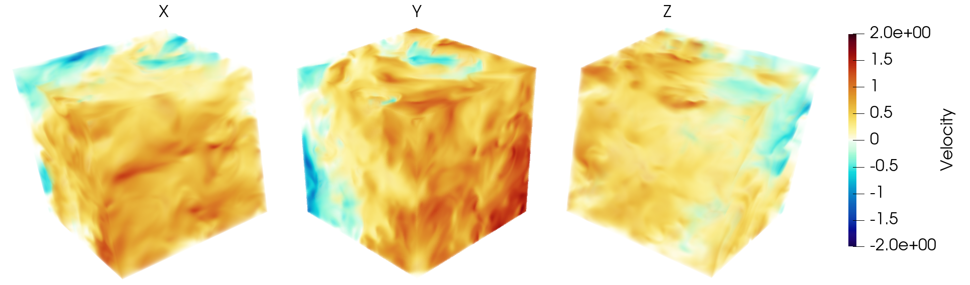 The objective of this problem is to learn the mapping between a low-resolution filtered 3D flow field to a high-fidelity solution. The flow field will be samples of a forced isotropic turbulence direct numerical simulation originally simulated with a resolution of \(1024^{3}\). This simulation solves the forced Navier-Stokes equations: