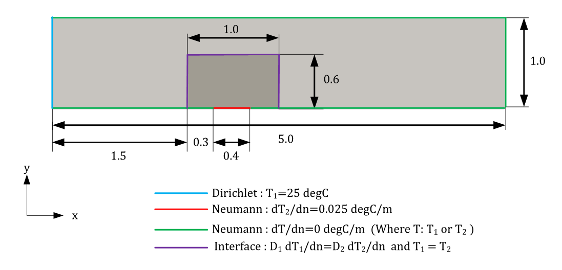 The geometry of the problem is a simple composite 2D geometry with different material conductivities. The heat source is placed in inside the material of higher conductivity to replicate the actual heatsink and scenario. The objective of this case is to mimic the orders of magnitude difference between Copper \((k=385 \text{ } W/m-K)\) and Air \((k=0.0261 \text{ } W/m-K)\). Therefore, set the conductivity of the heatsink and surrounding solid to 100 and 0.01 respectively.