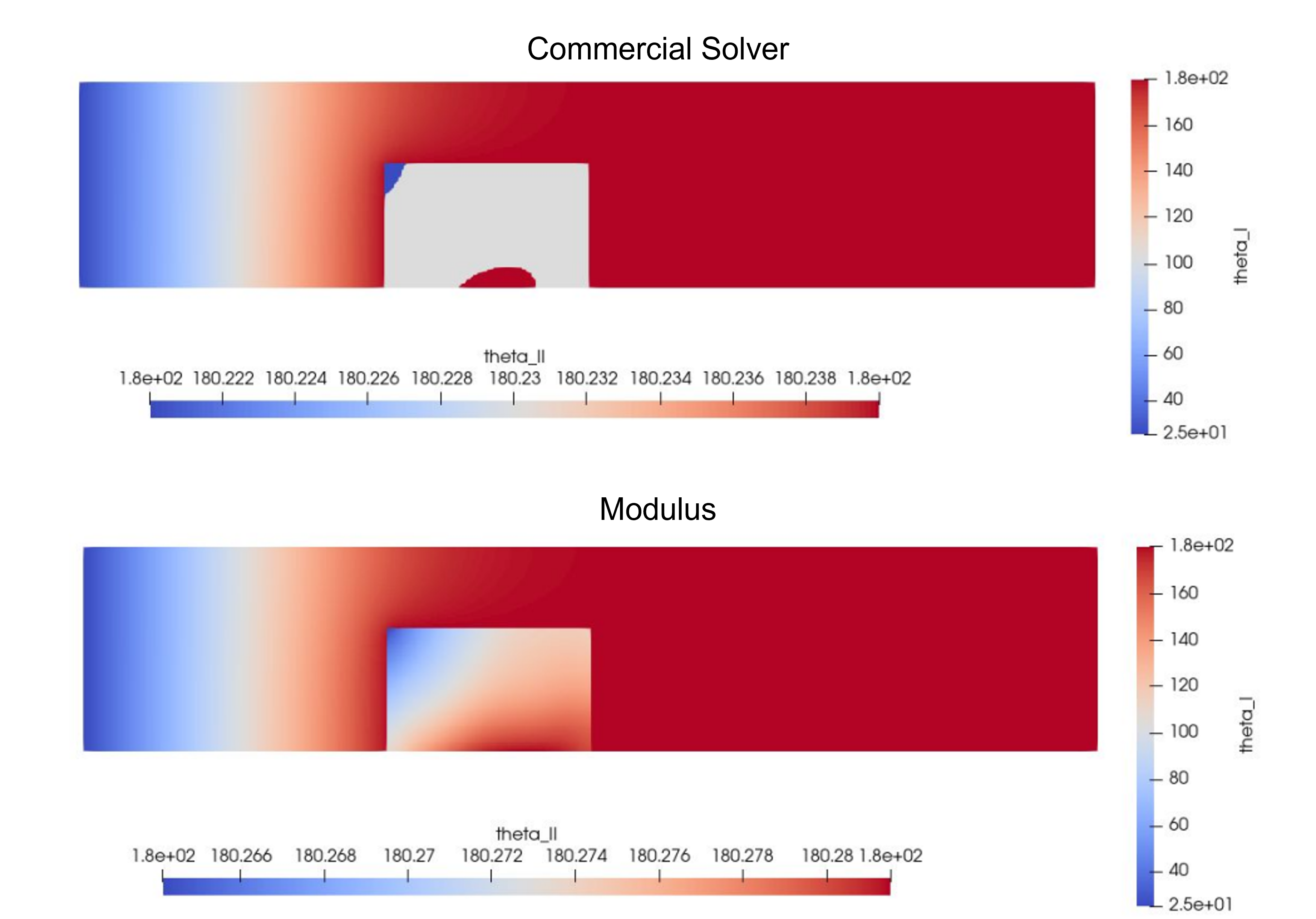 The figure below visualizes the thermal solution in solid and fluid. You can observe that PhysicsNeMo Sym prediction does a much better job in predicting the temperature continuity at the interface when compared to the commercial solution. We believe these differences in the solver results are due to the discretization errors and can be potentially fixed by improving the grid resolution at the interface. PhysicsNeMo Sym prediction however does not suffer from such errors and the physical constraints are respected to a better degree of accuracy.