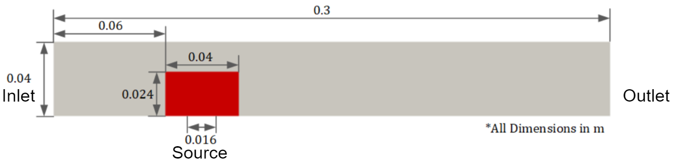 The geometry of the problem is very similar to the earlier case, except that now you have a fluid surrounding the solid chip and the dimensions of the geometry are more representative of a real heatsink geometry scales. The real properties for air and copper will also be used in this example. This example is also a good demonstrator for nondimensionalizing the properties/geometries to improve the neural network training. This figure shows the geometry and measurements for this problem.