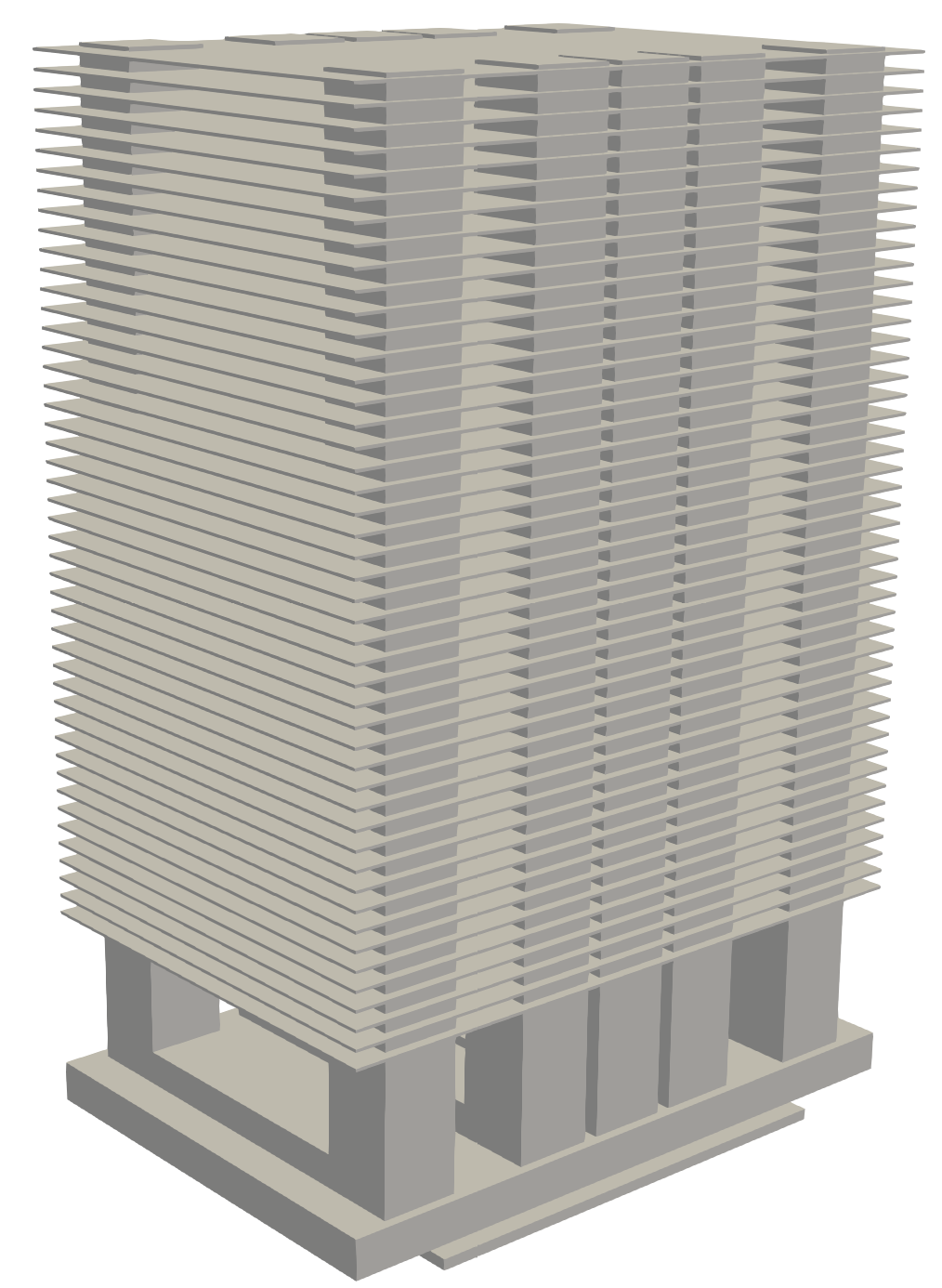 This tutorial solves the conjugate heat transfer problem of NVIDIA’s NVSwitch heat sink as shown in Fig. 204. Similar to the previous FPGA problem, the heat sink is placed in a channel with inlet velocity similar to its operating conditions. This case differs from the FPGA one, because you will be using the real heat properties for atmospheric air and copper as the heat sink material. Unlike Heat Transfer with High Thermal Conductivity, a hFTB algorithm will be used to handle the large conductivity differences.