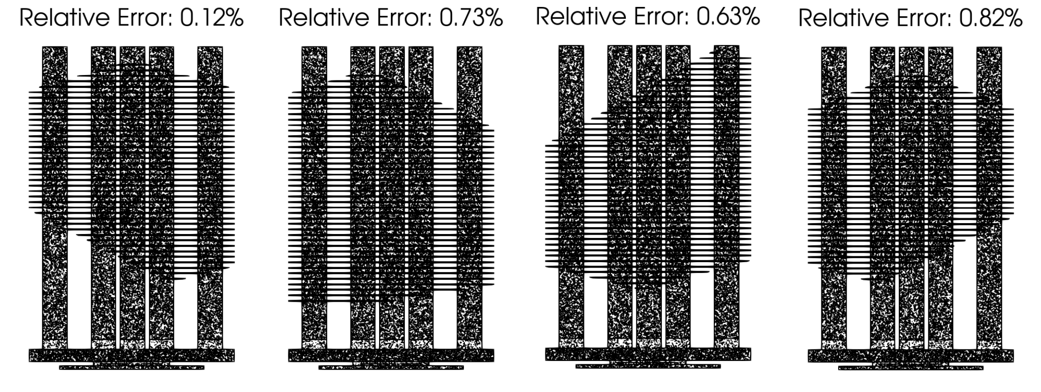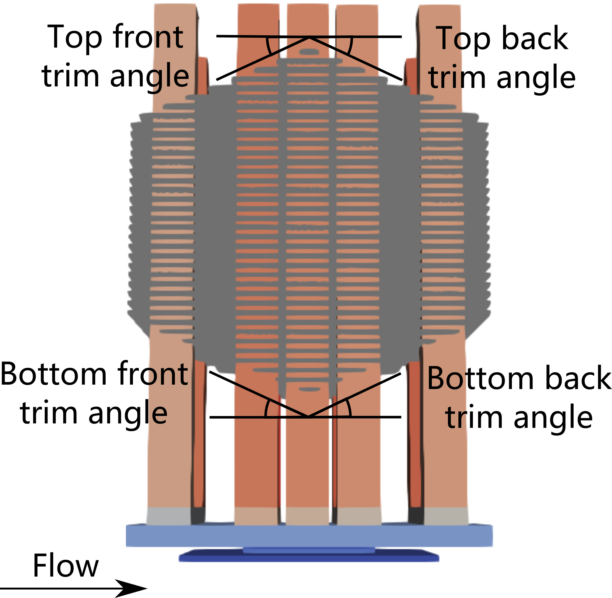 Here, to illustrate the gPC surrogate modeling accelerated via transfer learning, consider the NVIDIA’s NVSwitch heat sink introduced above. We introduce four geometry parameters related to fin cut angles, as shown in Fig. 207. We then construct a pressure drop surrogate. Similarly, one can also construct a surrogate for the peak temperature and use these two surrogates for design optimization of this heat sink.