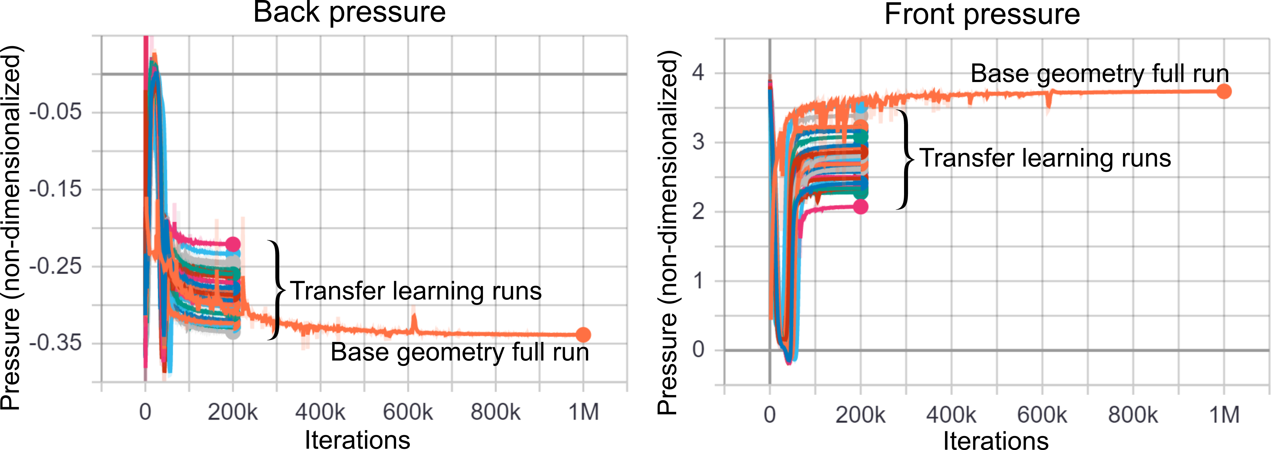 Fig. 208 shows the front and back pressure results for different runs. It is evident that the pressure has converged faster in the transfer learning runs compared to the base geometry full run, and that transfer learning has reduced the total time to convergence by a factor of 5.