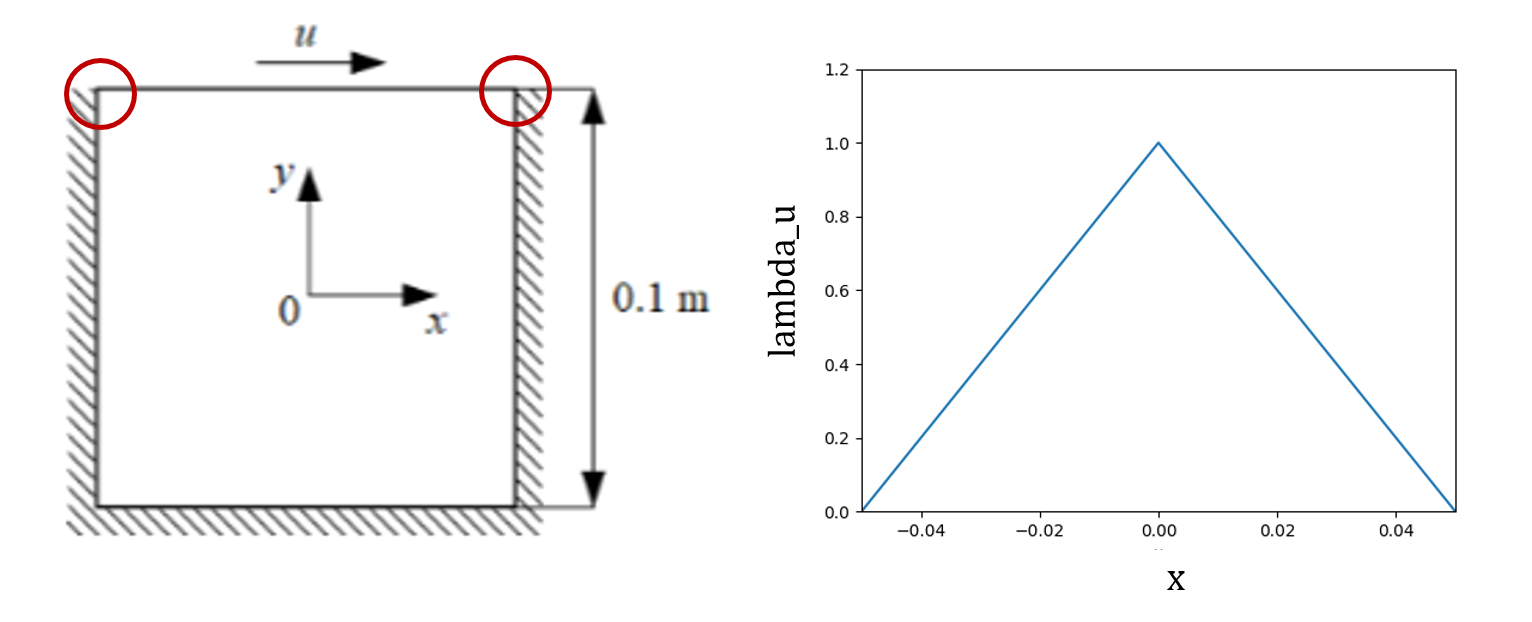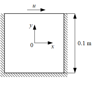 The geometry for the problem is shown in Fig. 16. The domain is a square cavity whose sides are each 0.1 m long. We define the center of the square as the origin of a Euclidean coordinate frame, with the x direction going left to right (increasing to the right), and the y direction going down to up (increasing up). The left, right, and bottom sides of the square domain are stationary walls, while the top wall moves in the x direction to the right at 1 \(m/s\).