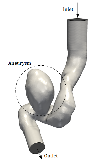 This simulation, uses a no-slip boundary condition on the walls of the aneurysm \(u,v,w=0\). For the inlet, a parabolic flow where the flow goes in the normal direction of the inlet and has peak velocity 1.5, is used. The outlet has a zero pressure condition, \(p=0\). The kinematic viscosity of the fluid is \(0.025\) and the density is a constant \(1.0\).