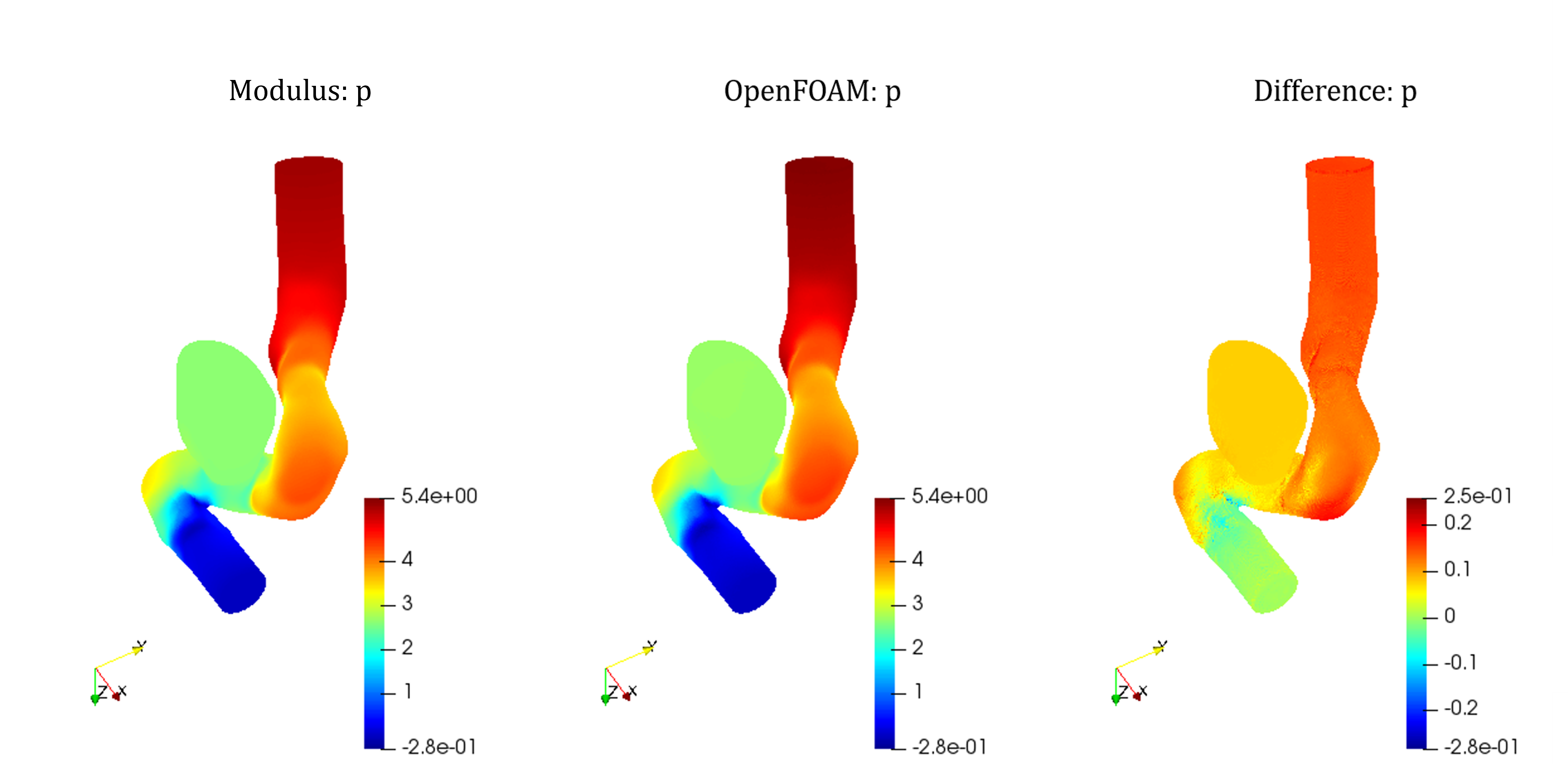 Fig. 158 Pressure across aneurysm. Left: PhysicsNeMo Sym. Center: OpenFOAM. Right: Difference#