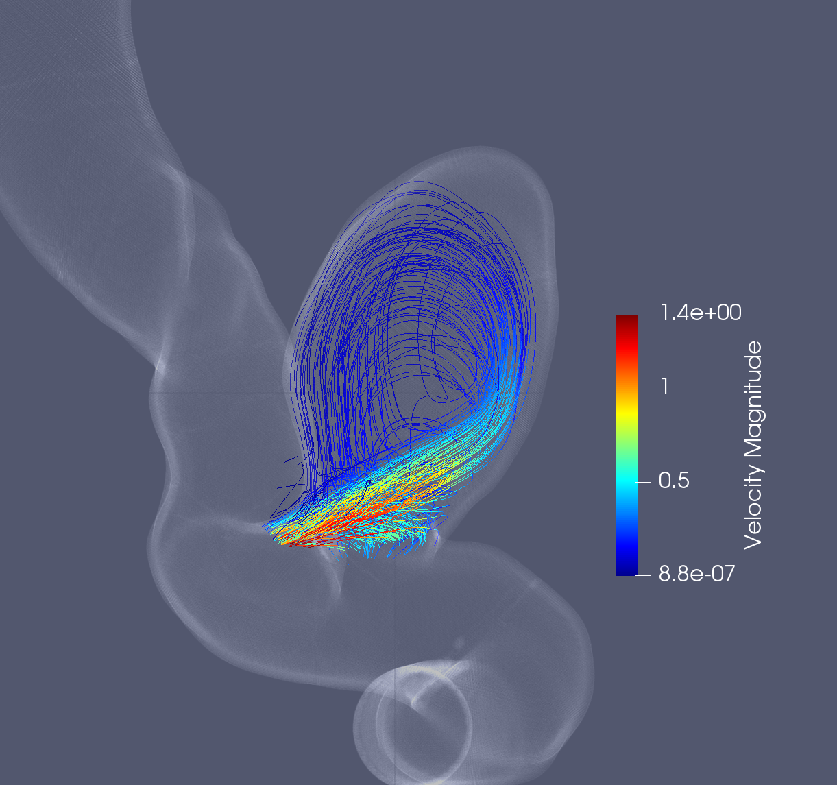 Fig. 159 Flow streamlines inside the aneurysm generated from PhysicsNeMo Sym simulation.#