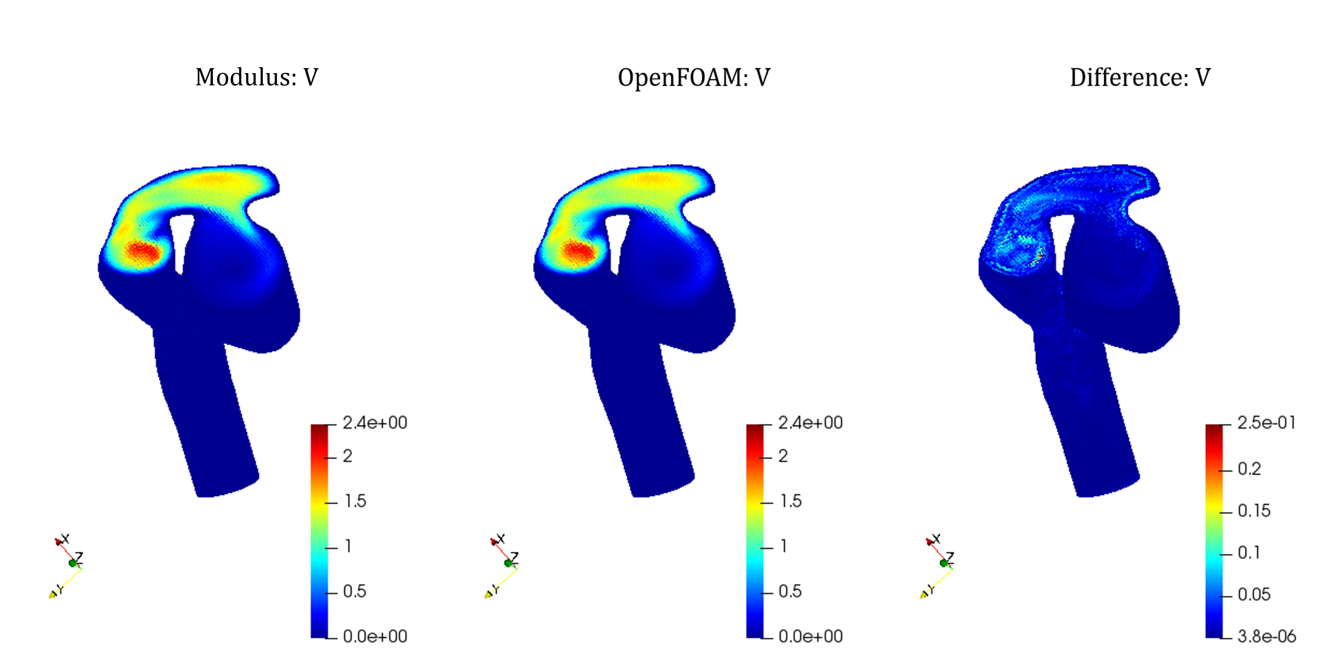 Fig. 157 Cross-sectional view aneurysm showing velocity magnitude. Left: PhysicsNeMo Sym. Center: OpenFOAM. Right: Difference#