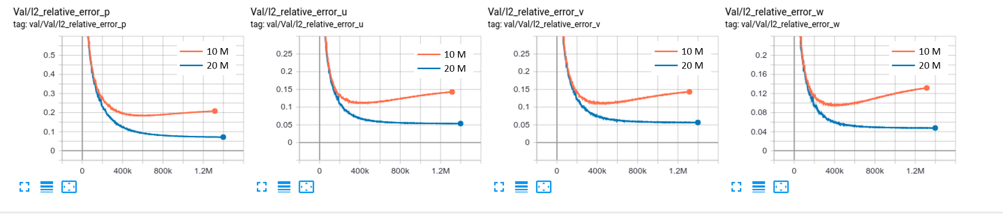 We use this tutorial to give an example of overfitting of training data in the PINNs. Fig. 156 shows the comparison of the validation error plots achieved for two different point densities. The case using 10 M points shows an initial convergence which later diverges even when the training error keeps reducing. This implies that the network is overfitting the sampled points while sacrificing the accuracy of flow in between them. Increasing the points to 20 M solves that problem and the flow field is generalized to a better resolution.