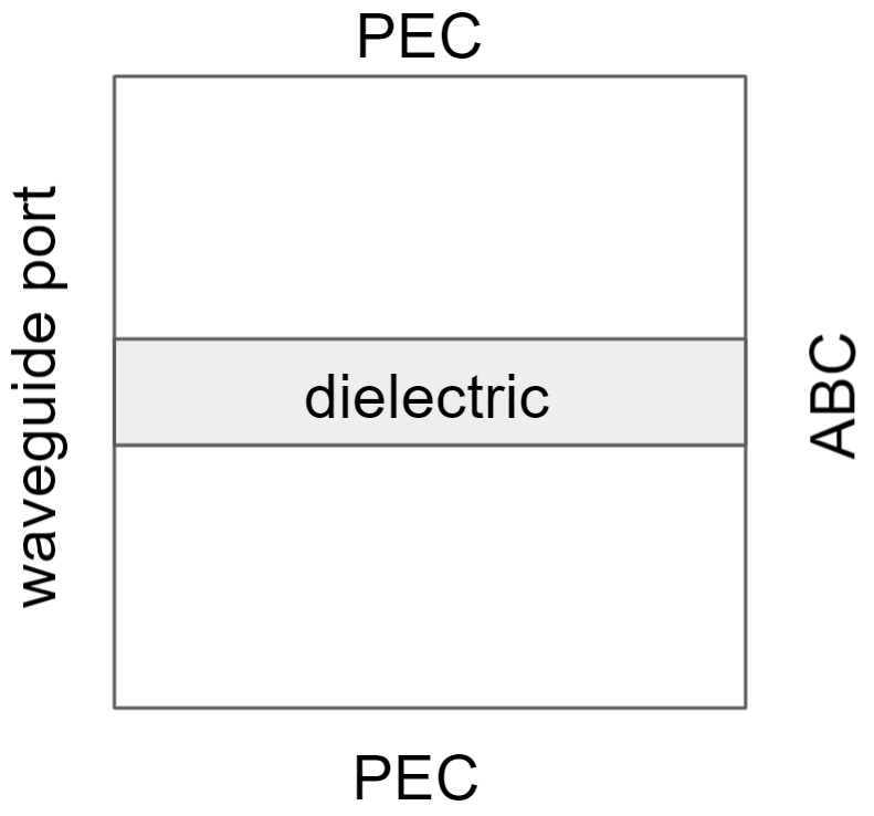 where \(k\) is the wavenumber. Notice in 2D scalar case, the PEC and ABC will be simplified in the following form, respectively: