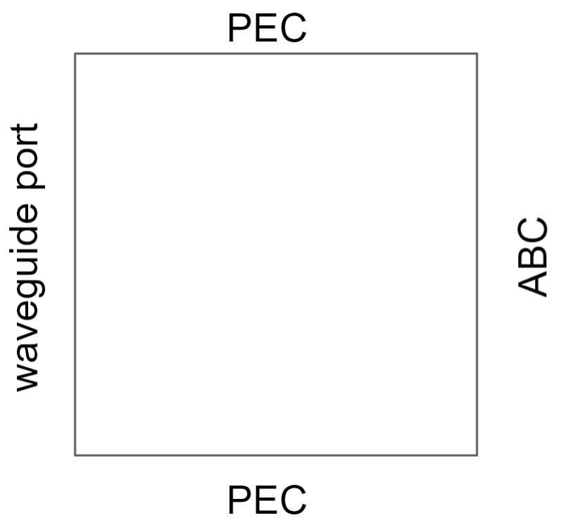Consider a 2D domain \(\Omega=[0, 2]\times [0, 2]\) as shown below. The whole domain is vacuum. Say, relative permittivity \(\epsilon_r = 1\). The left boundary is a waveguide port while the right boundary is absorbing boundary (or ABC). The top and the bottom is PEC.