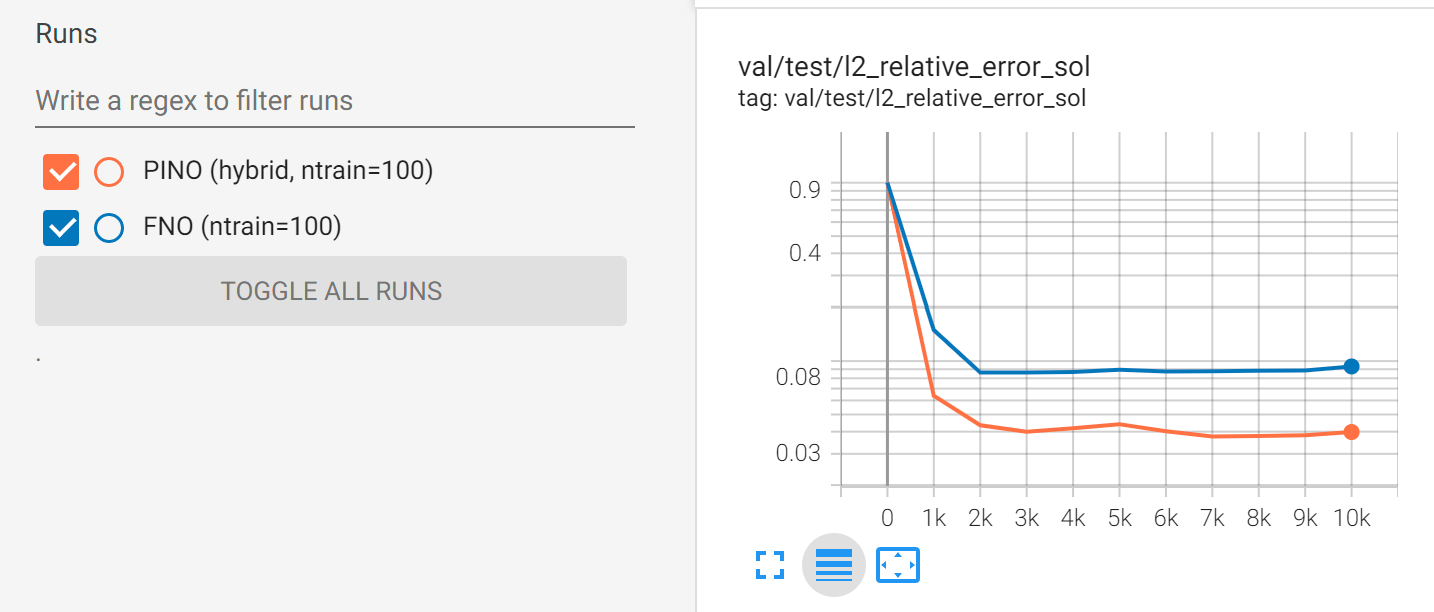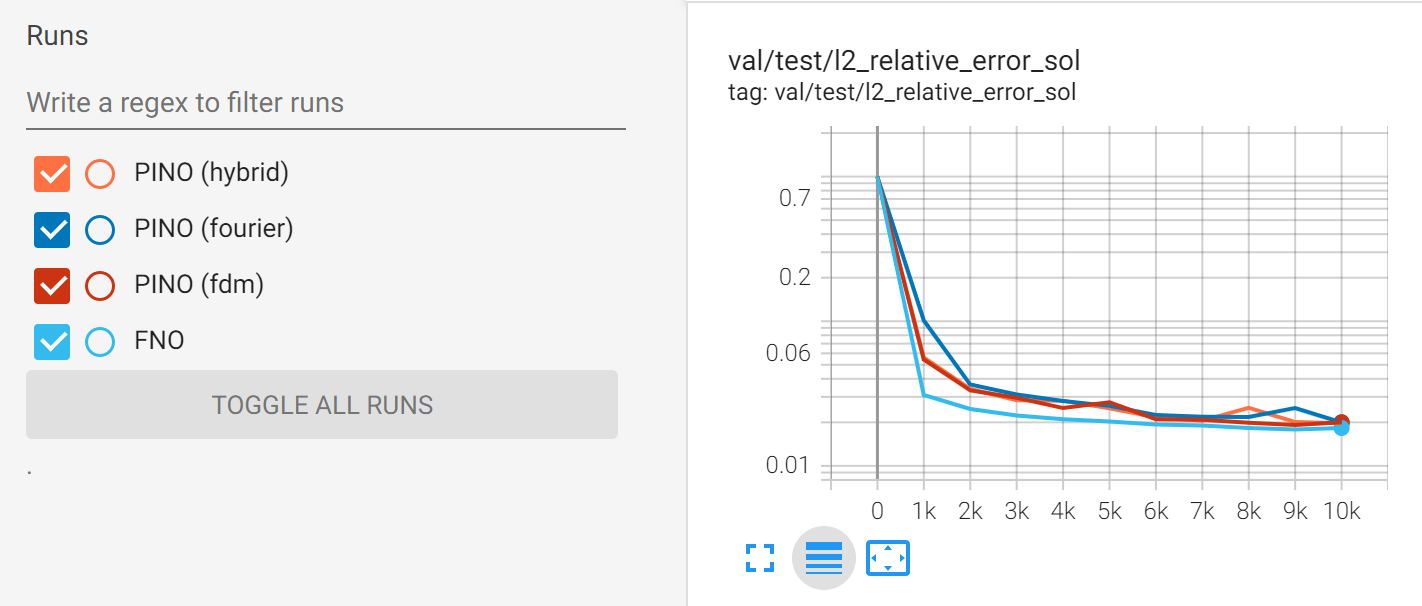 The TensorBoard plot below compares the validation loss of PINO (all three gradient methods) and FNO. You can see that with large amounts of training data (1000 training examples), both FNO and PINO perform similarly.