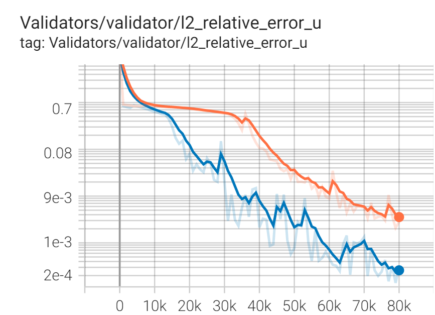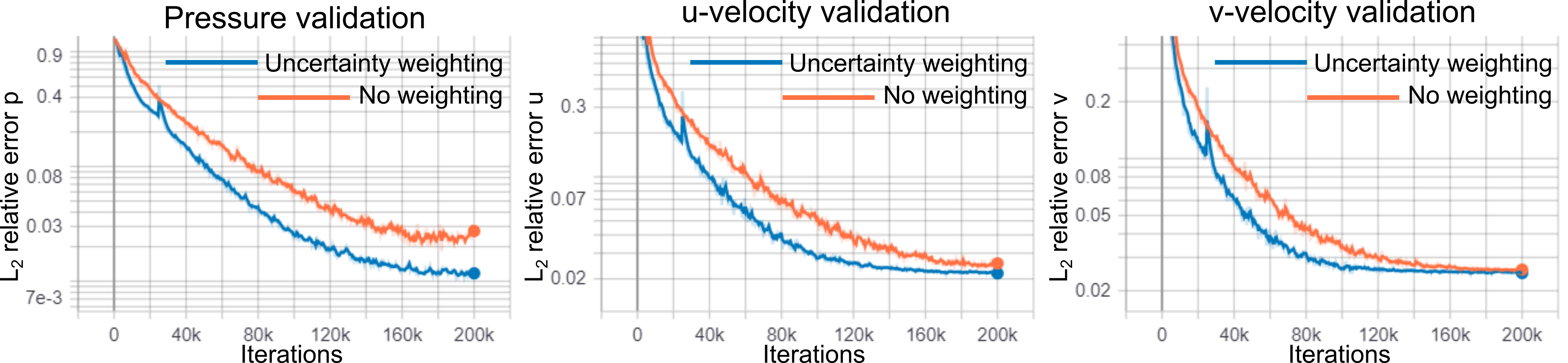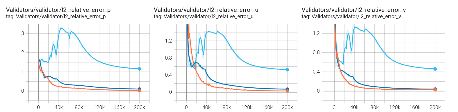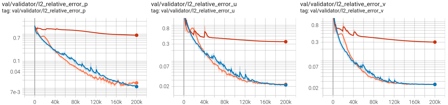In the reference paper, GradNorm has shown to be effectively improving the accuracy and reducing overfitting for various network architectures and in both classification and regression tasks. Here, we have observed that GradNorm can also be effective in loss balancing of neural network solvers. In particular, we have tested the performance of GradNorm on the annular ring example by assigning a very small initial weight to the momentum loss terms and keeping the other loss weights intact compared to the base case. This is to evaluate whether it can recover appropriate loss weights throughout the training by starting from this poor initial loss weighting. Validation results are shown in the figure below. The blue line shows the base case, red shows the case where momentum equation are weighted by \(1e-4\) and no loss balancing algorithm is used, and orange shows the same case but with GradNorm used for loss balancing. It is evident that failure to balance the weight of the loss terms appropriately in this test case will result in convergence failure, and that GradNorm can effectively accomplish this.