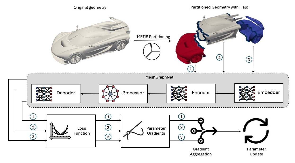 X-MeshGraphNet (code): The Base MeshGraphNet model, and more generally GNNs, face some limitations, including scalability issues, requirements for meshing at the inference, and challenges in handling long-range interactions. X-MeshGraphNet is scalable, multi-scale extension of MeshGraphNet designed to address these challenges. X-MeshGraphNet overcomes the scalability bottleneck by partitioning large graphs and incorporating halo regions that enable seamless message passing across partitions. This, combined with gradient aggregation, ensures that training across partitions is equivalent to processing the entire graph at once. To remove the dependency on simulation meshes, X-MeshGraphNet constructs custom graphs directly from tessellated geometry files (for example, STLs) by generating point clouds on the surface or volume of the object and connecting k-nearest neighbors. Additionally, the model builds multi-scale graphs by iteratively combining coarse and fine-resolution point clouds, where each level refines the previous, allowing for efficient long-range interactions. X-MeshGraphNet maintains the predictive accuracy of the full-graph MeshGraphNet, while significantly improving scalability and flexibility. The use of halo regions and gradient aggregation ensures that the partitioning does not compromise the accuracy, making it equivalent to training on the full graph while significantly reducing memory and computational overhead. See the X-MeshGraphNet paper for more details.