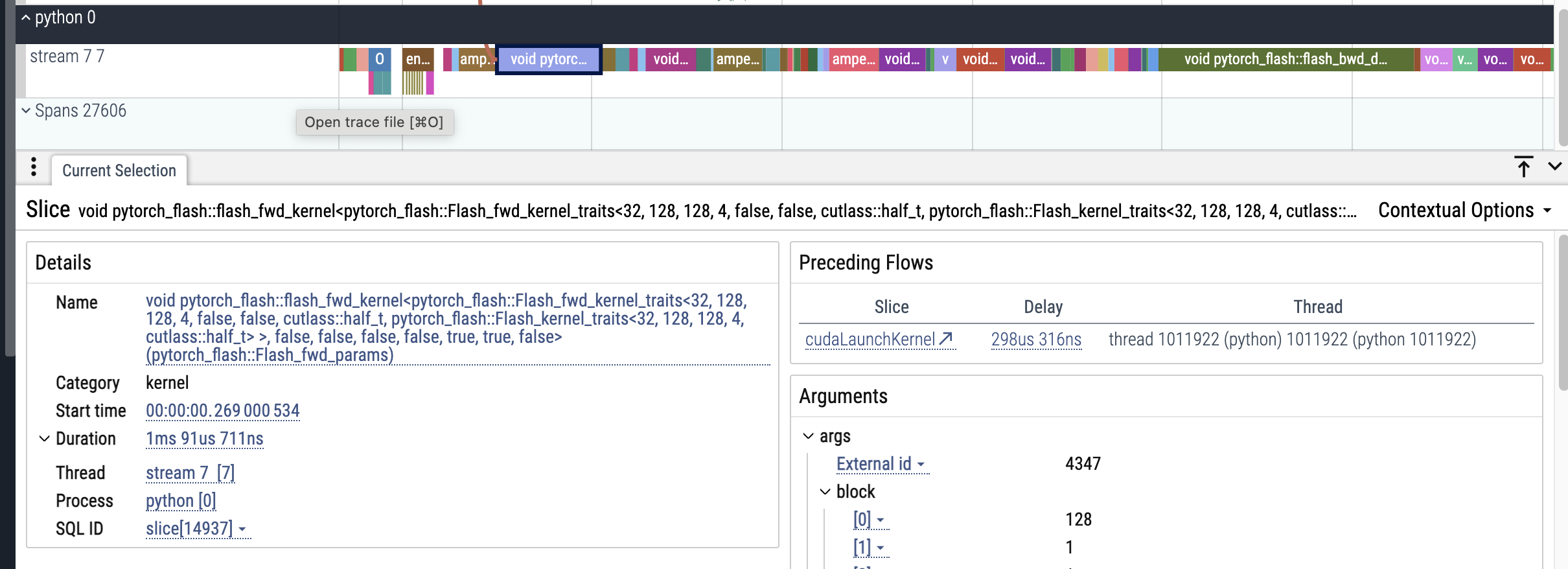 And in the profile, we can see that the total time spent in the flash attention kernel is more than 10% of the original time. Other kernels are also running significantly faster in mixed precision.