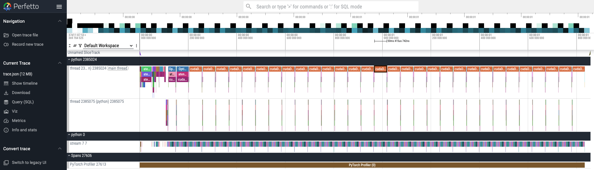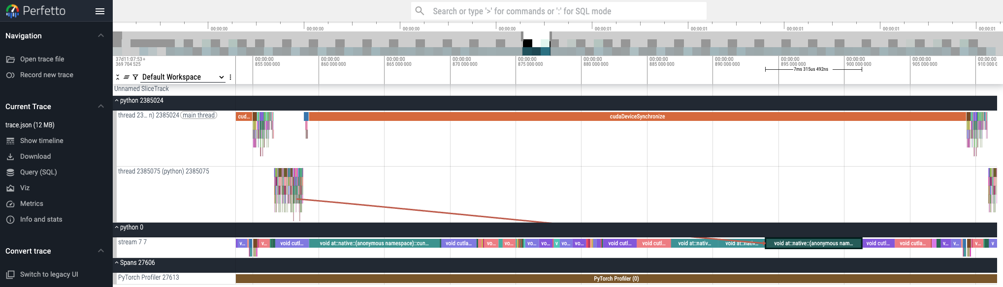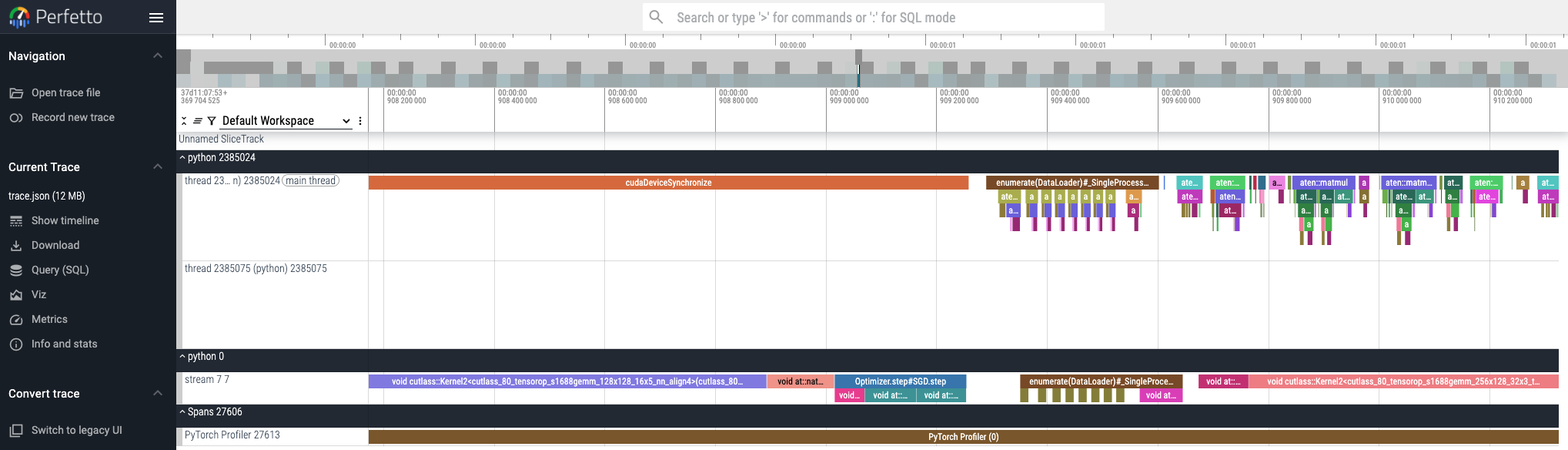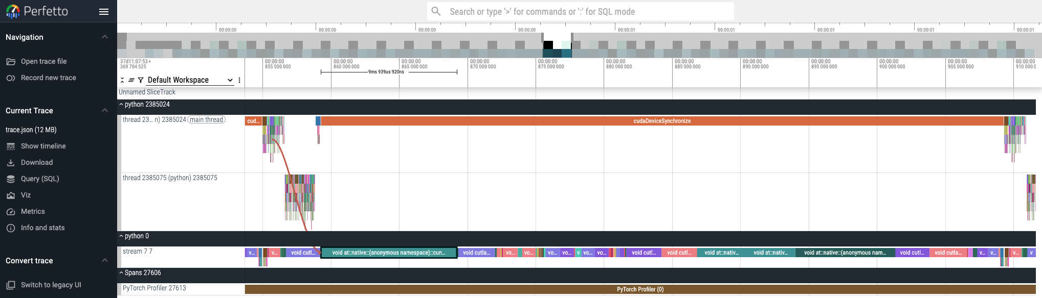 The output of the torch profiler will be in the physicsnemo_profiling_outputs/torch directory. The most useful output produced is a trace of the operations in the workload. This can be viewed by copying the file to a system that has the chrome browser, and viewing the file at ui.perfetto.dev: