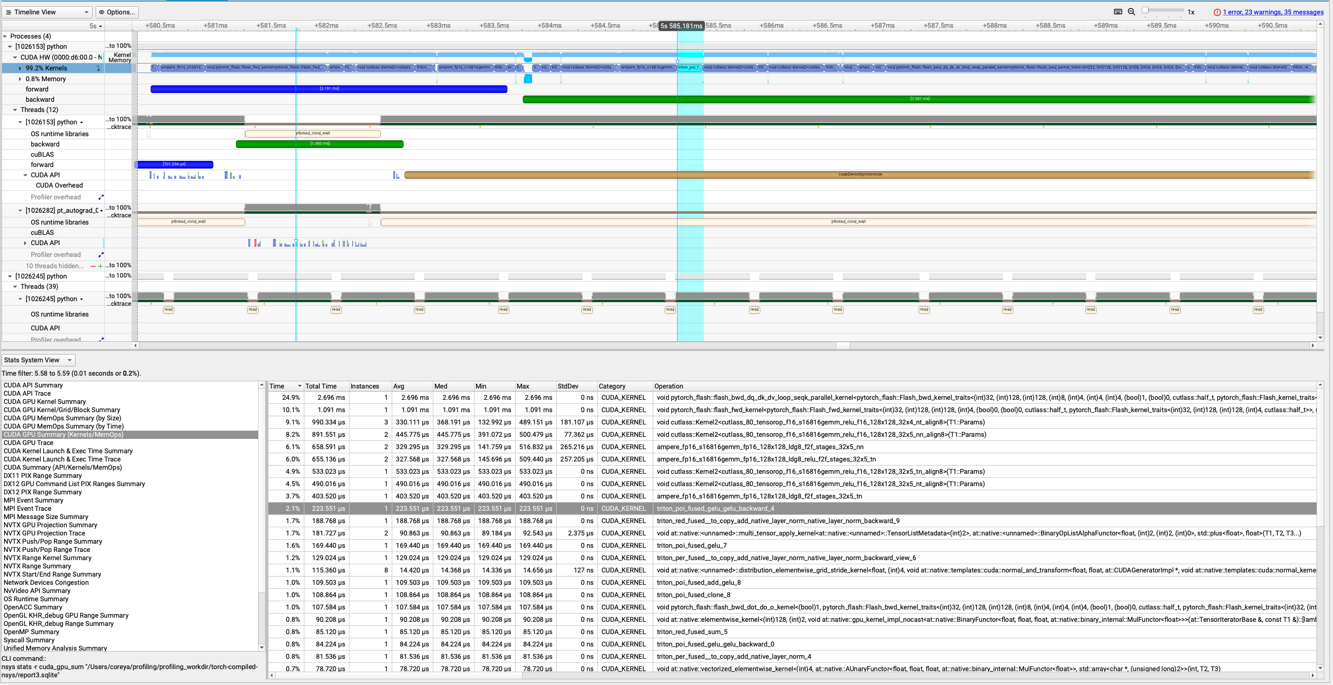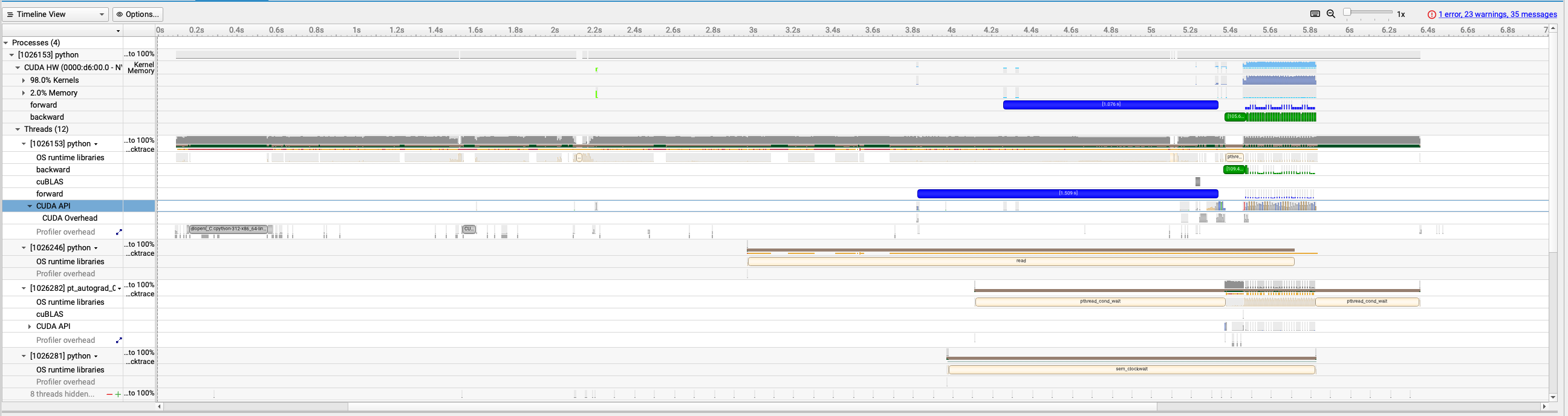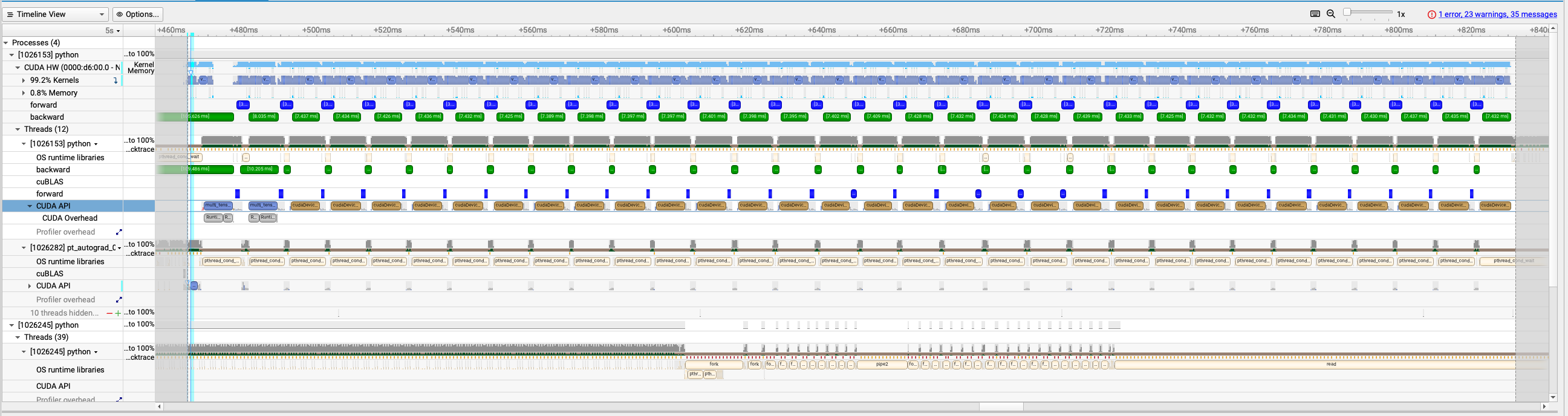 Fig. 4 Chrome trace view showing CPU threads and CUDA kernels. The top bars show CPU threads while the bottom shows CUDA kernel execution.#