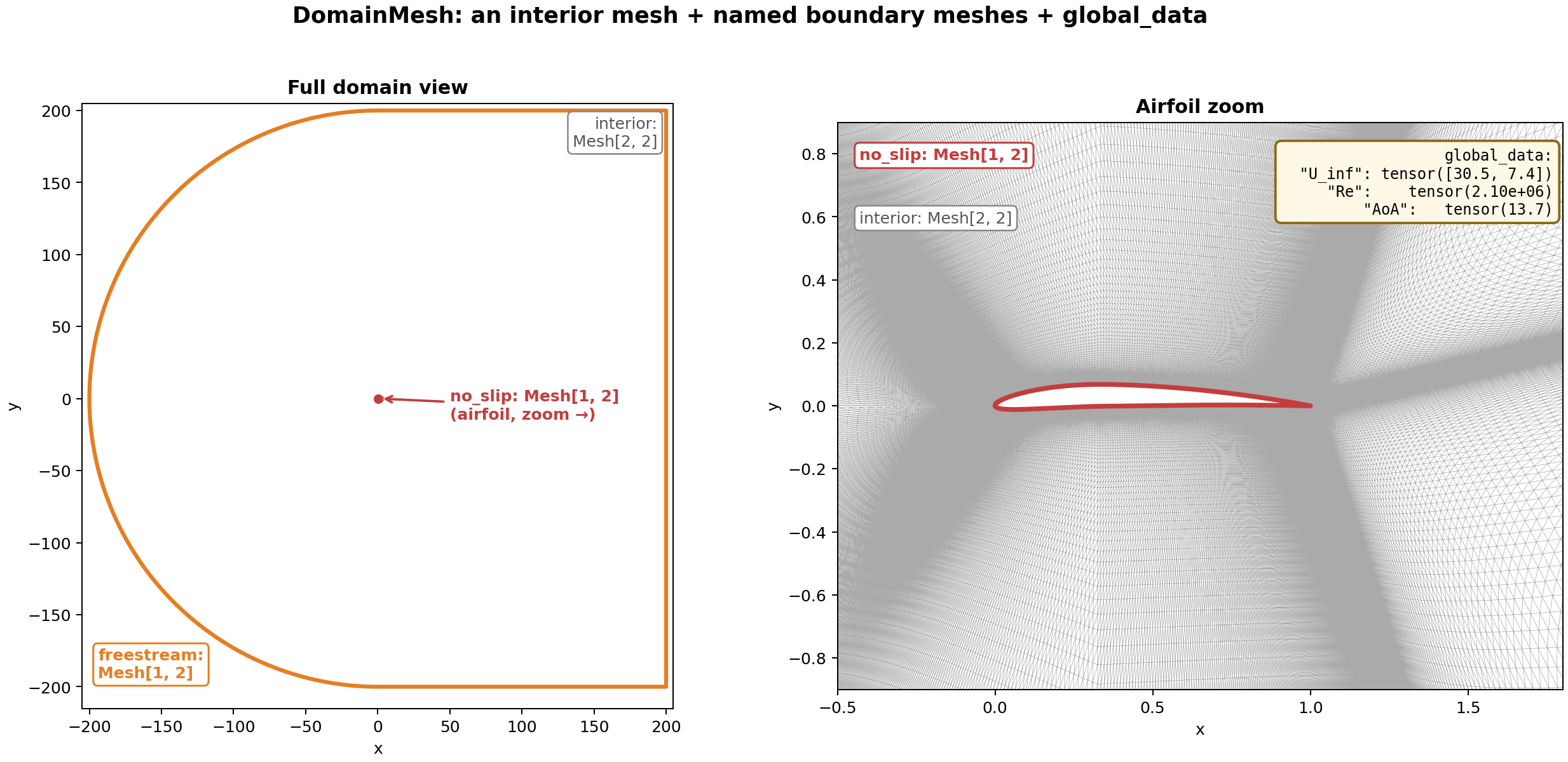 TensorDictmapping string keys (typically BC type names like"no_slip","freestream","inlet") toMeshobjects representing each boundary patch.``global_data``: a