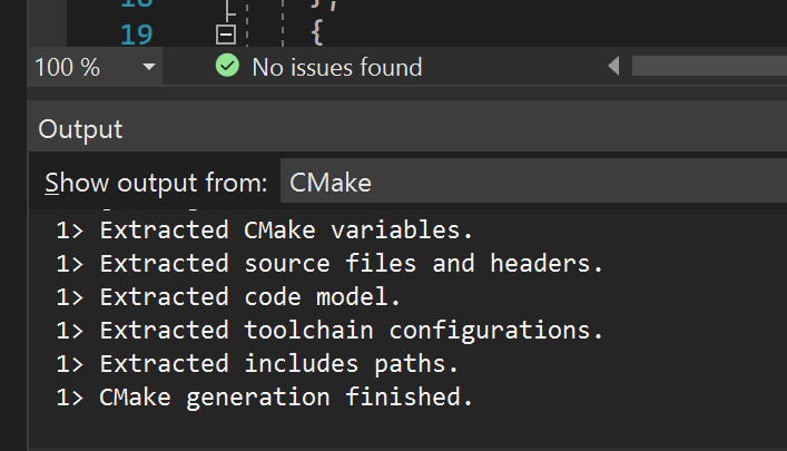 Manage configurations. Visual Studio generates aCMakePresets.jsonfile for you, which is now displayed in the file editor. This file may be configured to change the profiles in which your project may be buit. For options, see https://cmake.org/cmake/help/latest/manual/cmake-presets.7.html.CMake configuration now may take place automatically. If it doesn’t or it fails for some reason, select