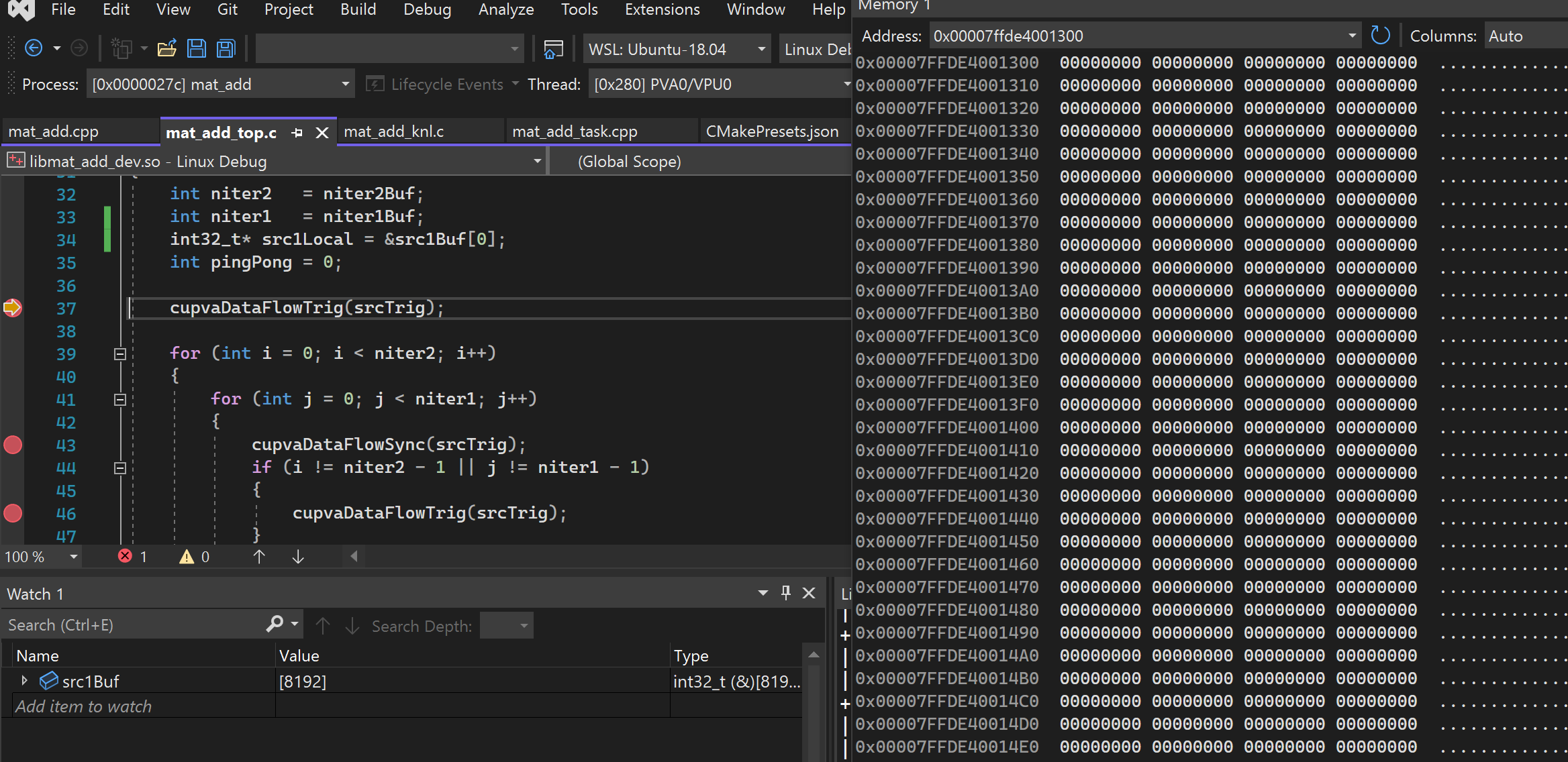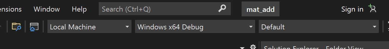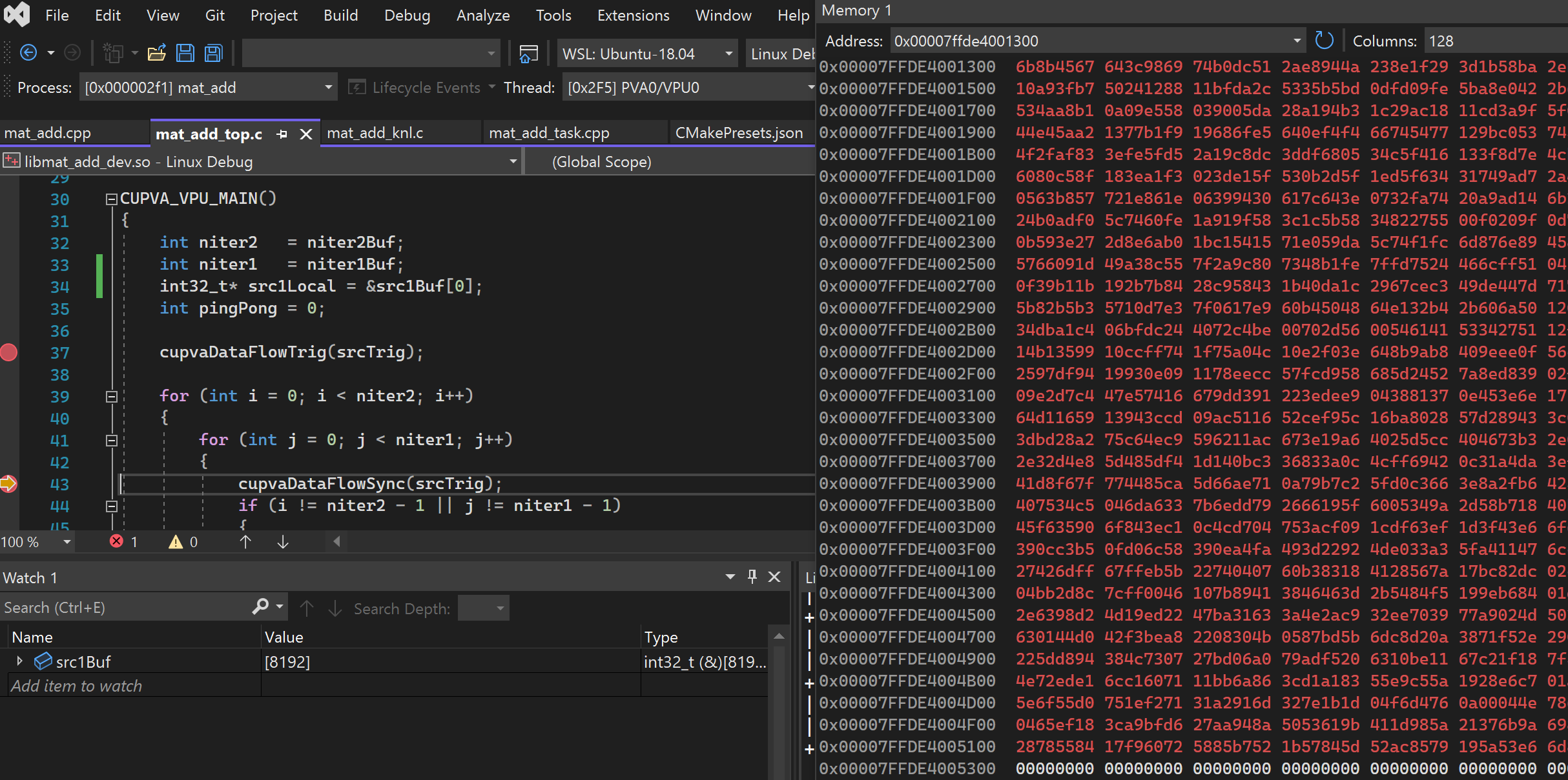 Select startup itemmenu, choose the top level executable (in our case it ismat_add).You can now debug using Visual Studio, including with features such as memory window.