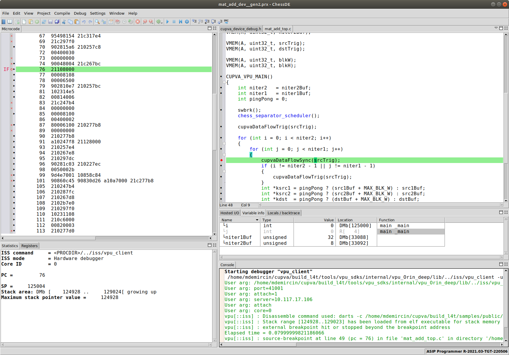 From here, you can add breakpoints, inspect memories, step through code, inspect registers and more. For full information on using ChessDE, refer to the appropriate third party software documentation. Some tips are provided below on making productive use of ChessDE with PVA’s VPU.