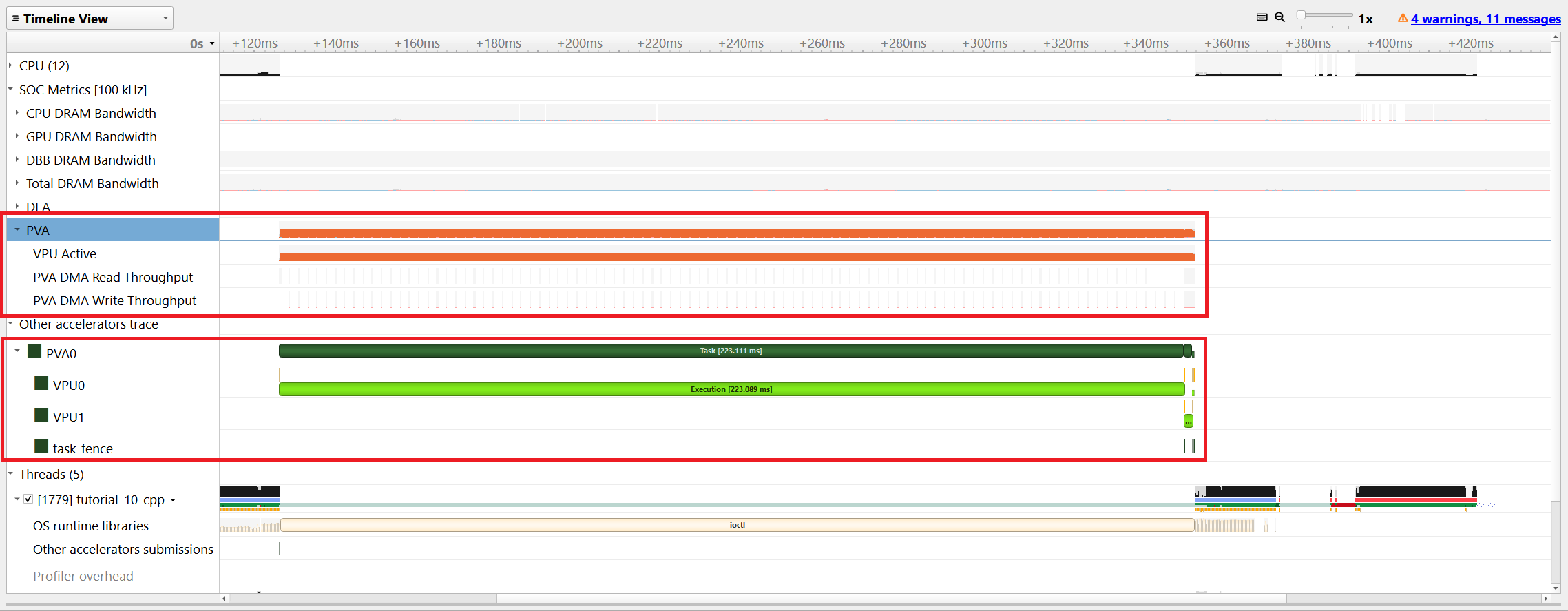 The scheduling of PVA tasks along with other processors and accelerators can be viewed in the Nsight Systems Timeline view. There are two row blocks that display PVA specific profiling information.