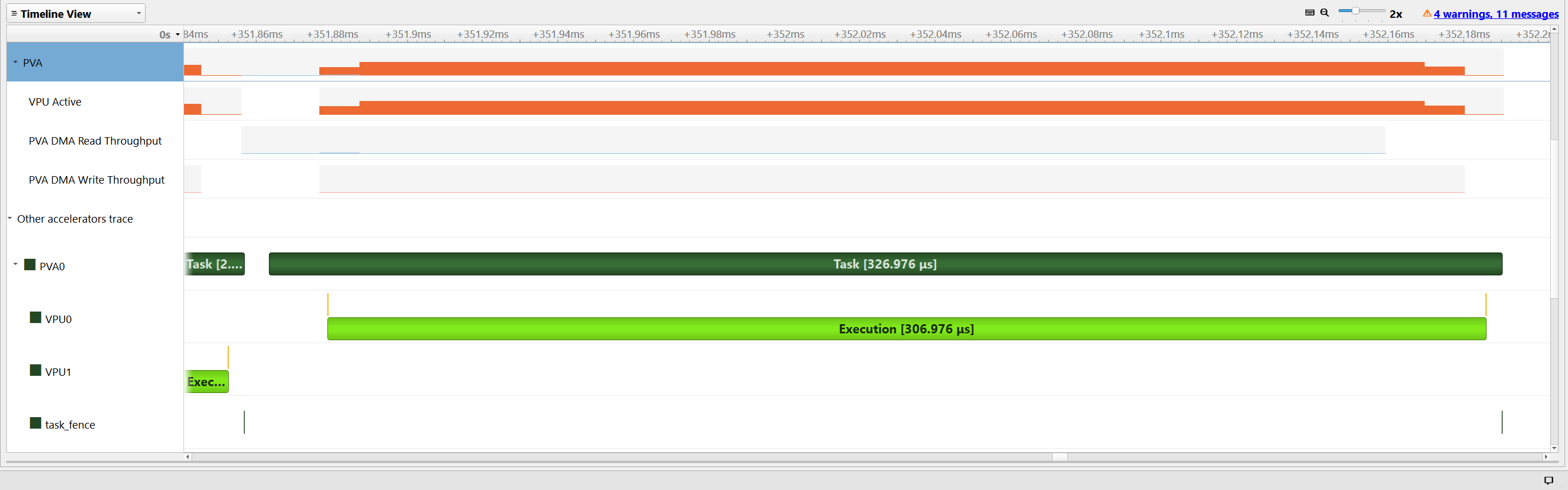 The PVA row under the “Other accelerators trace” displays the start and end timing of each PVA task and fence expiration times.