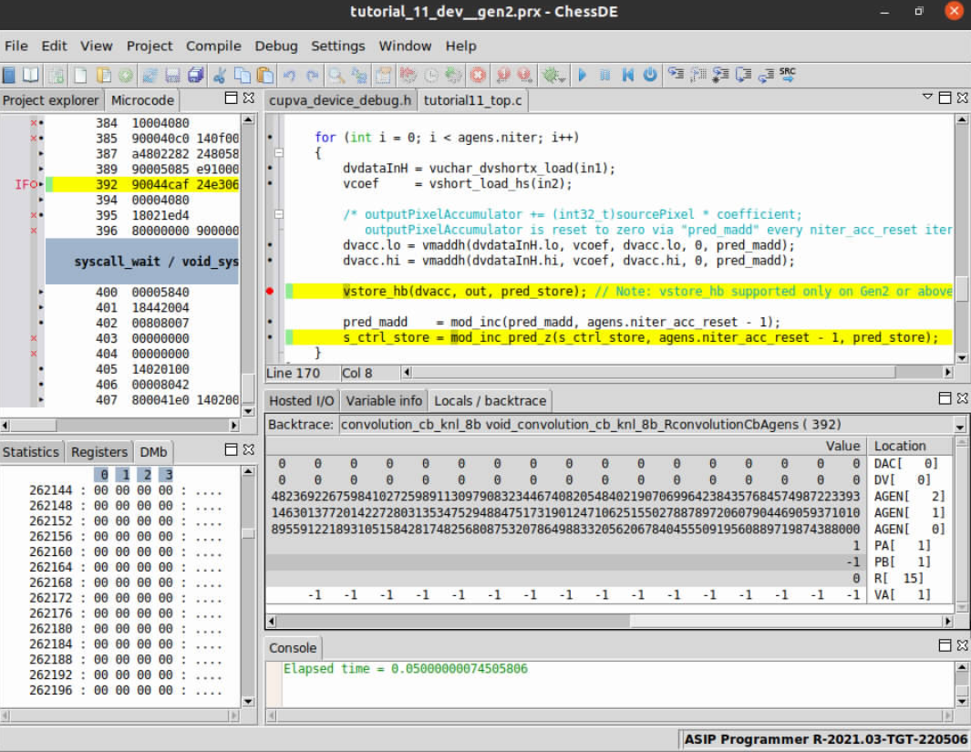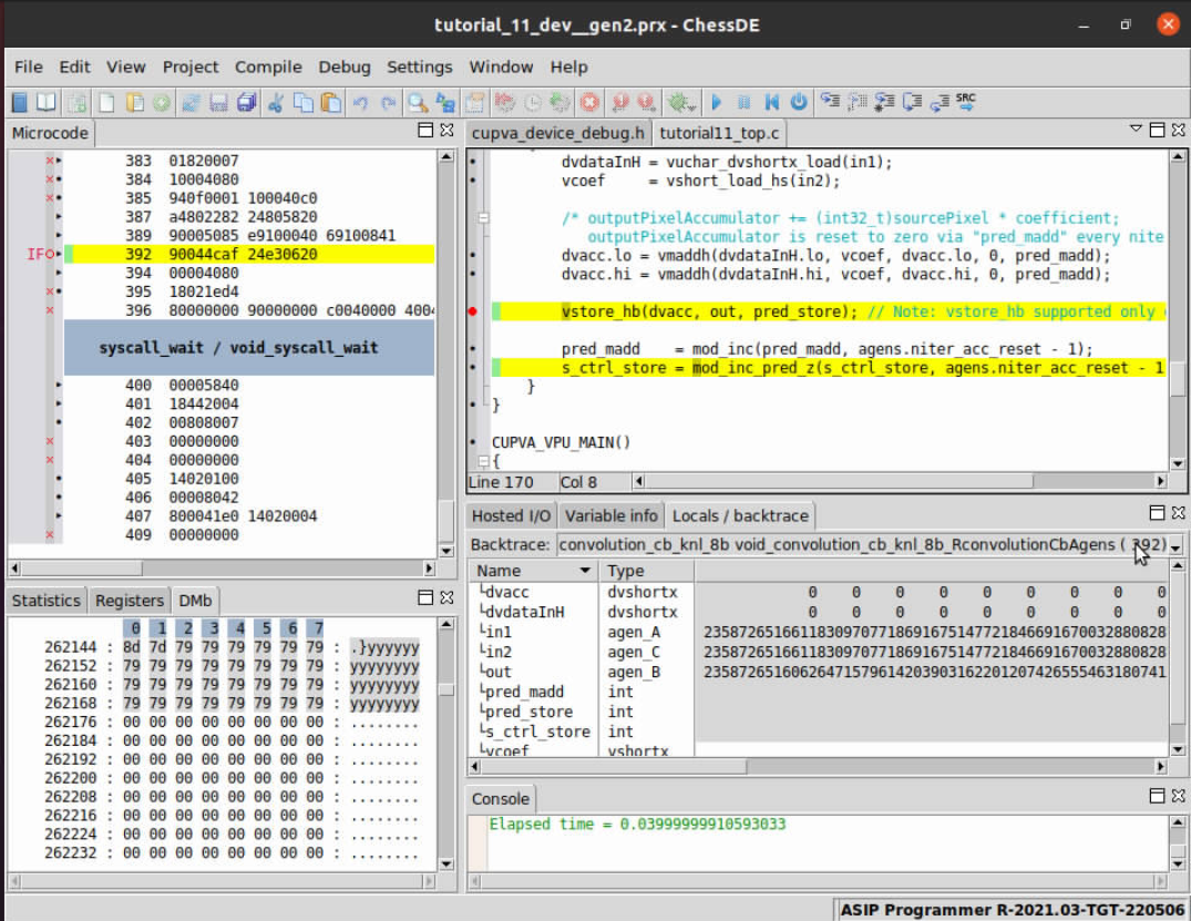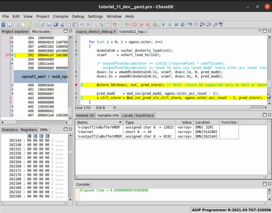 Now that the project files are open in ChessDE and we have successfully connected to the target we start debugging the code to find the root cause of the issue. A first step you might take to understand what is going on during program executation is to check input memories to confirm if the correct input/output data resides in the VPU’s internal memory (VMEM).