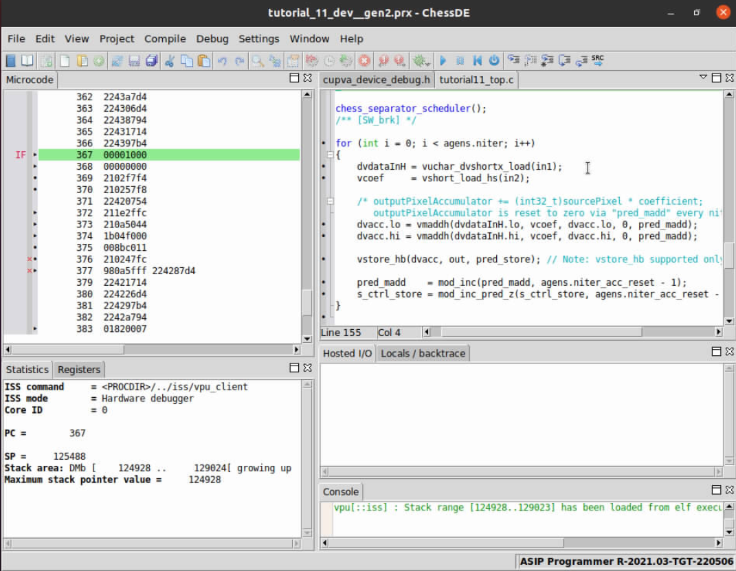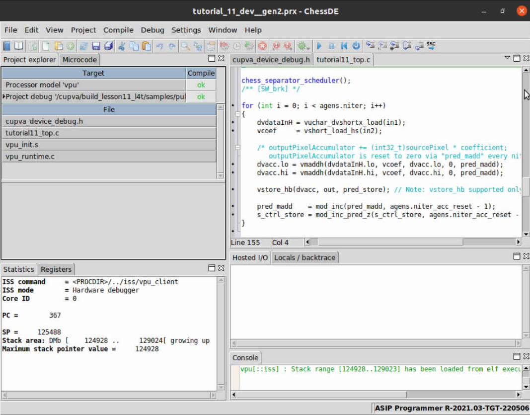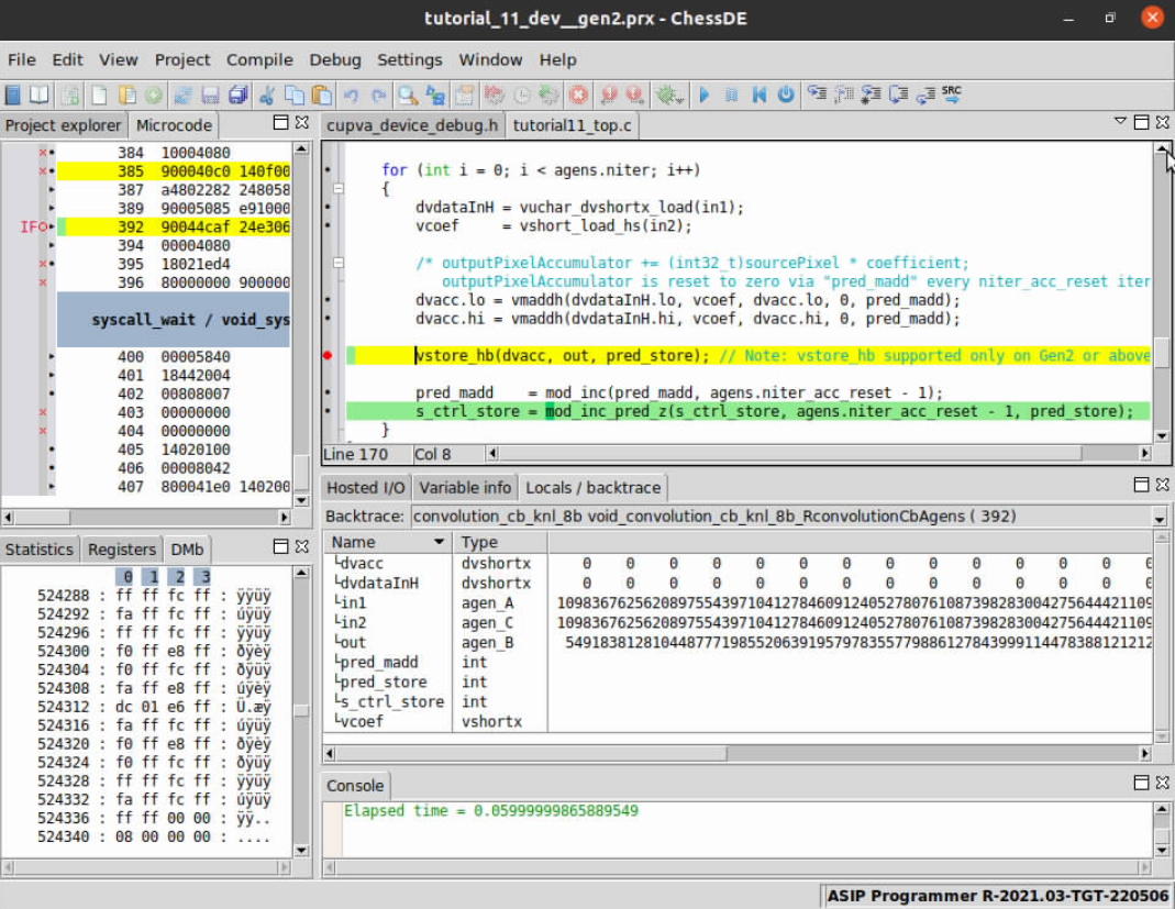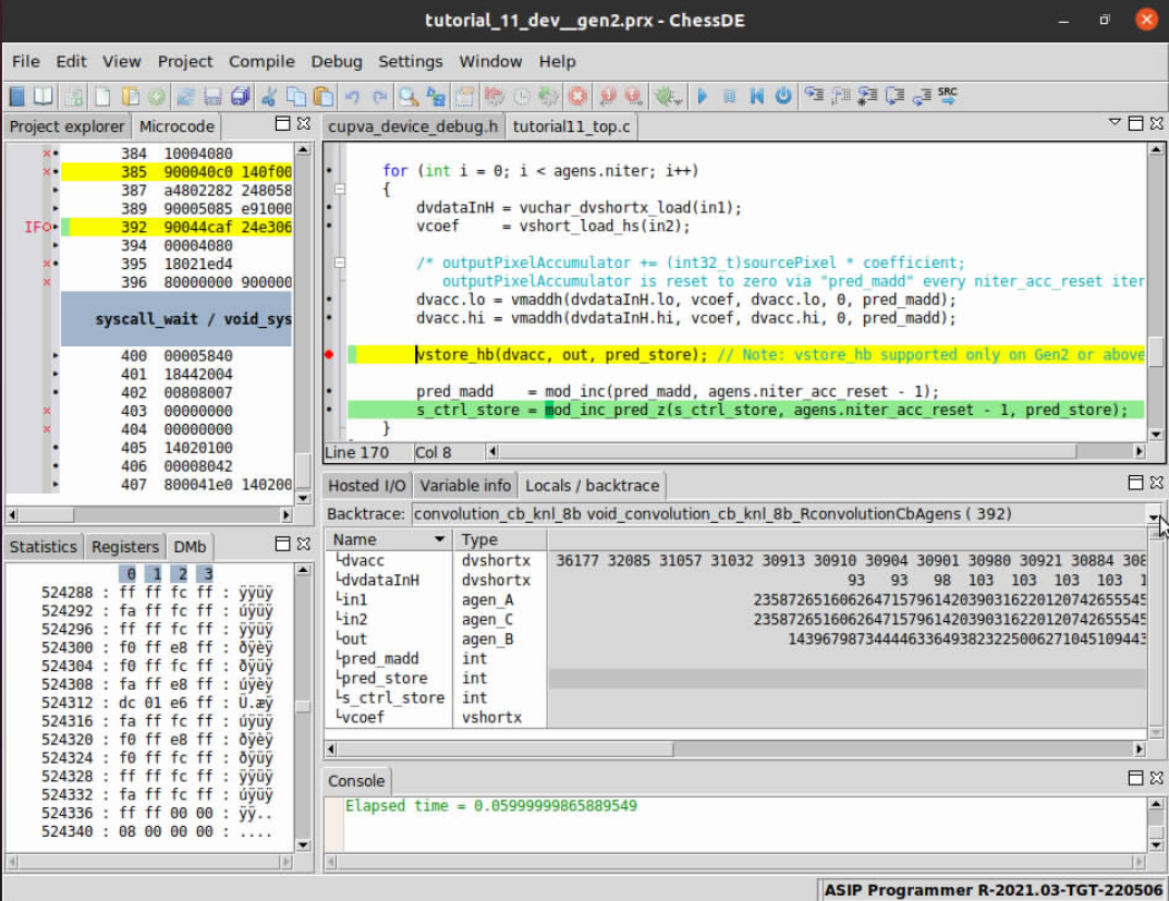 Now that the project files are open in ChessDE and we have successfully connected to the target we start debugging the code to find the root cause of the issue. A first step you might take to understand what is going on during program executation is to check input memories to confirm if the correct input/output data resides in the VPU’s internal memory (VMEM).