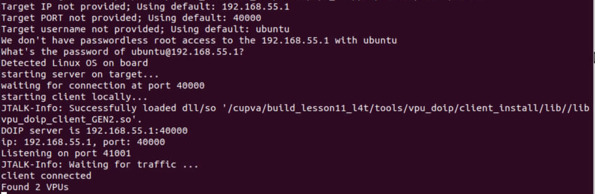 After running the DOIP script you should see in the console output that it has detected your target HW and found the VPU cores, as shown in the following image.