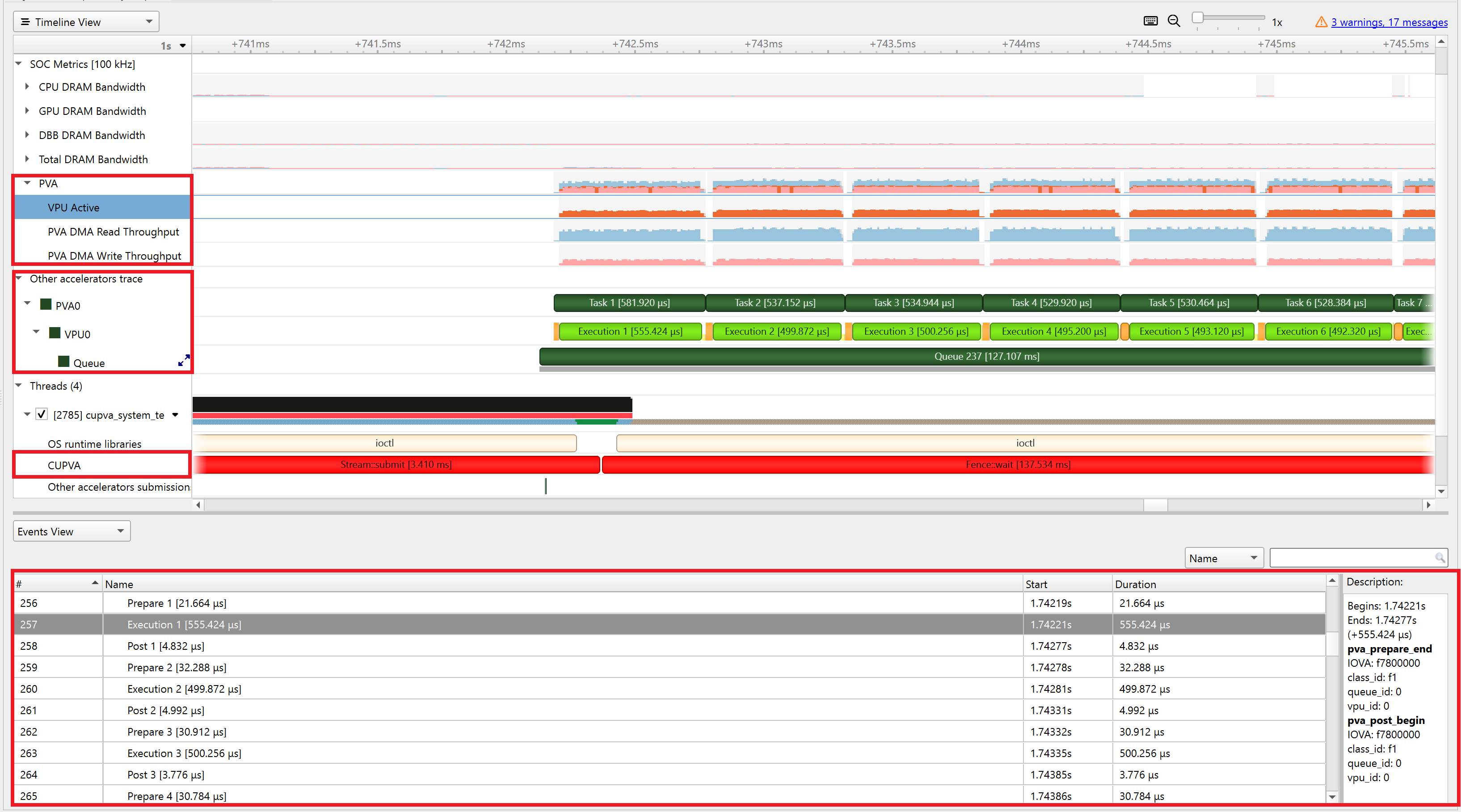 Timeline View. The overall VPU utilization and DMA throughput info can be viewed in thePVAsection of SOC Metrics, and detailed timing information for all submitted VPU tasks is in theOther accelerators tracesection. The detailed VPU task events can be listed in theEvents Viewsection by right-clicking on the VPU row and selecting theShow Events View. Timing of the cuPVA command submission and fence wait host-side APIs are shown in the cuPVA row of theThreadssection.