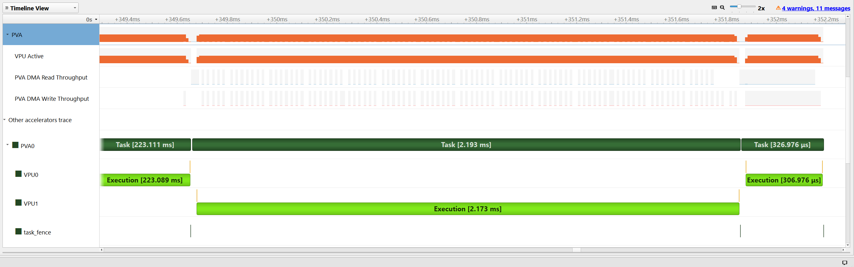 The PVA row under the “Other accelerators trace” displays the start and end timing of each PVA task and fence expiration times.