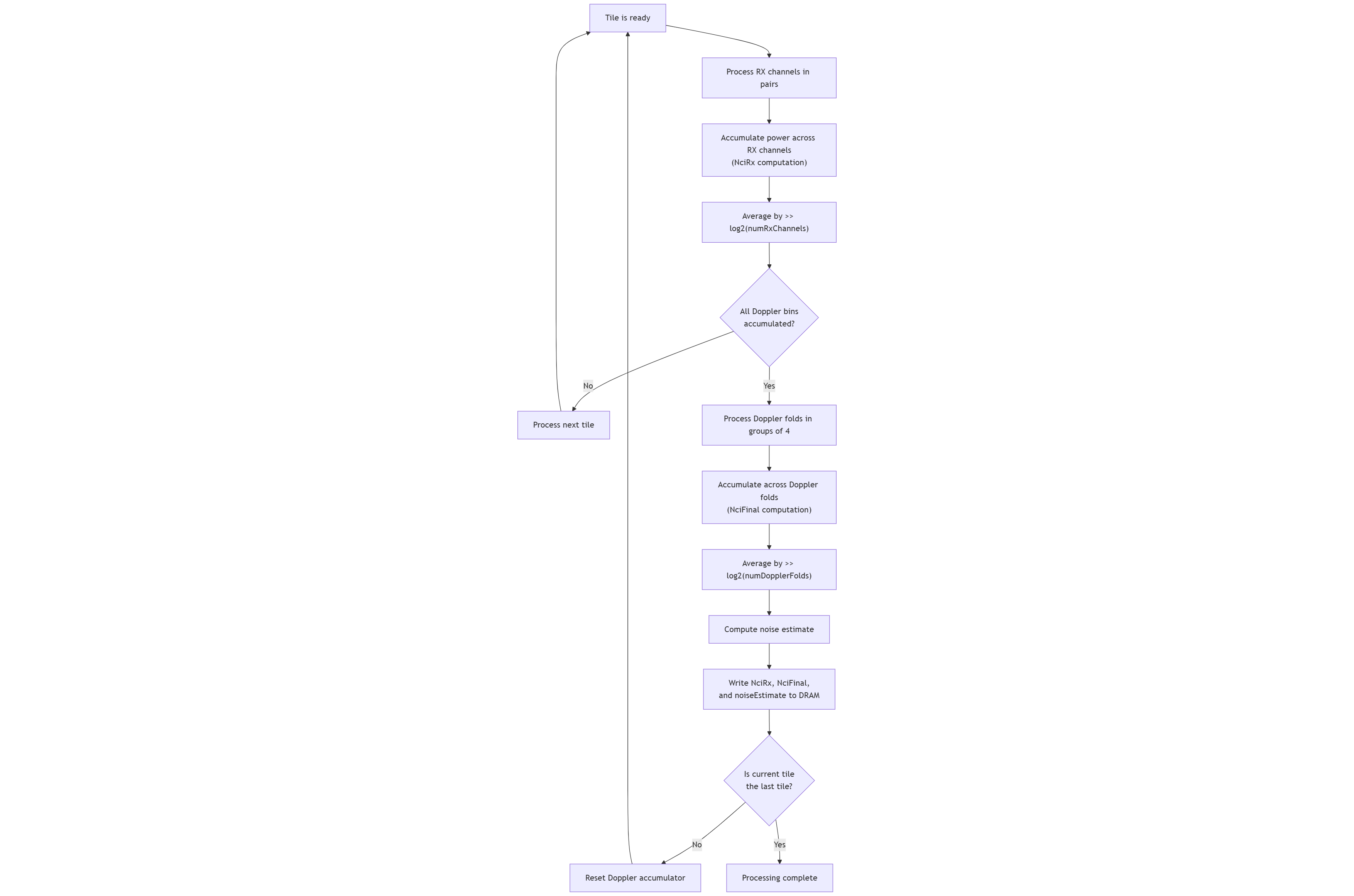 Input tiles may not have all Doppler bins for a channel, so the NCI accumulation for Doppler folds and noise estimation are done after all Doppler bins are accumulated, which may be after one or more input tiles are processed.