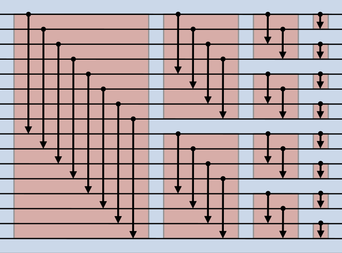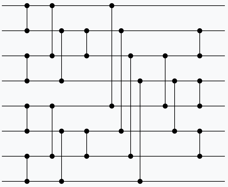 Figure 1 illustrates the sorting network for even-odd merge sort. The horizontal lines represent input elements. The vertical connections represent comparators which perform compare-and-swap operations between the connected inputs.