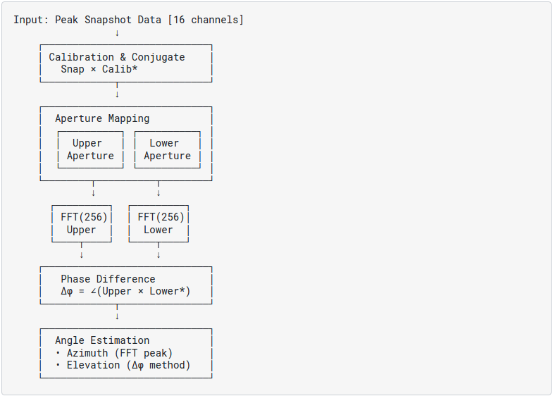 (10)#\[θ_{elevation} = \arcsin\left(\frac{\text{PhaseDiff}}{2π \cdot d_{elevation}/λ}\right)\]where: