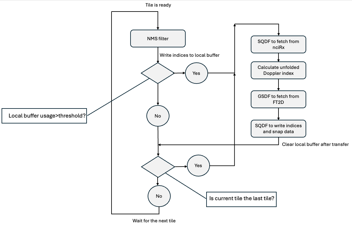 The computation part in these two steps is simple. The main challenge here is that the number of indices per tile is not fixed. And a 1000 maximum number of peaks cannot be fitted into one VMEM. Therefore, the current implementation uses a local peak buffer within one VMEM and accumulates the output of NMS and judges whether the buffer’s usage exceeds some threshold that requires calculating the unfolded Doppler index and snapshot data, then transfers the result to DRAM. Apparently, this changes the device side’s processing flow, since originally PVA can finish the NMS operations among all tiles and then perform the following steps. The processing flow is shown in the following figure: