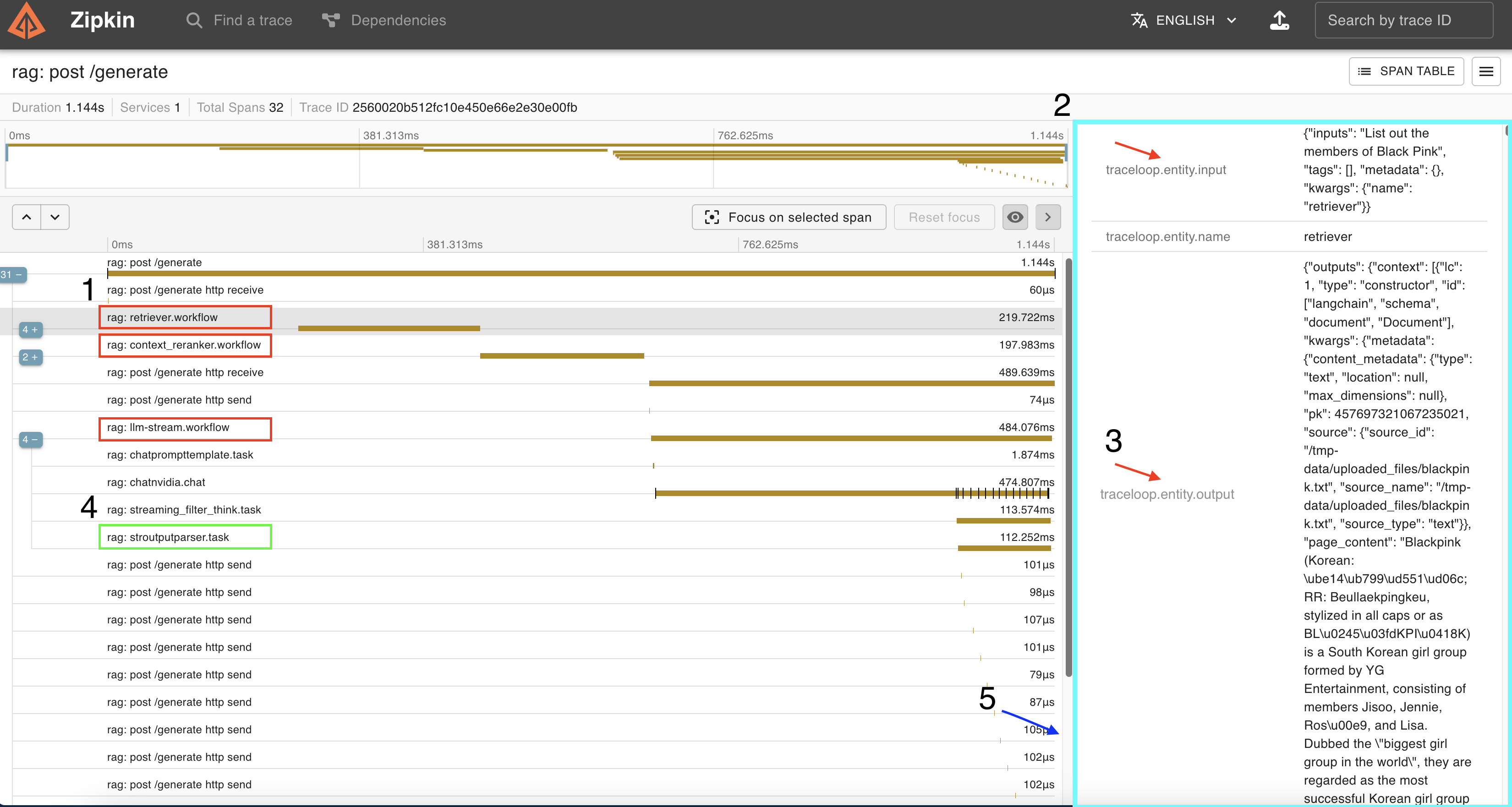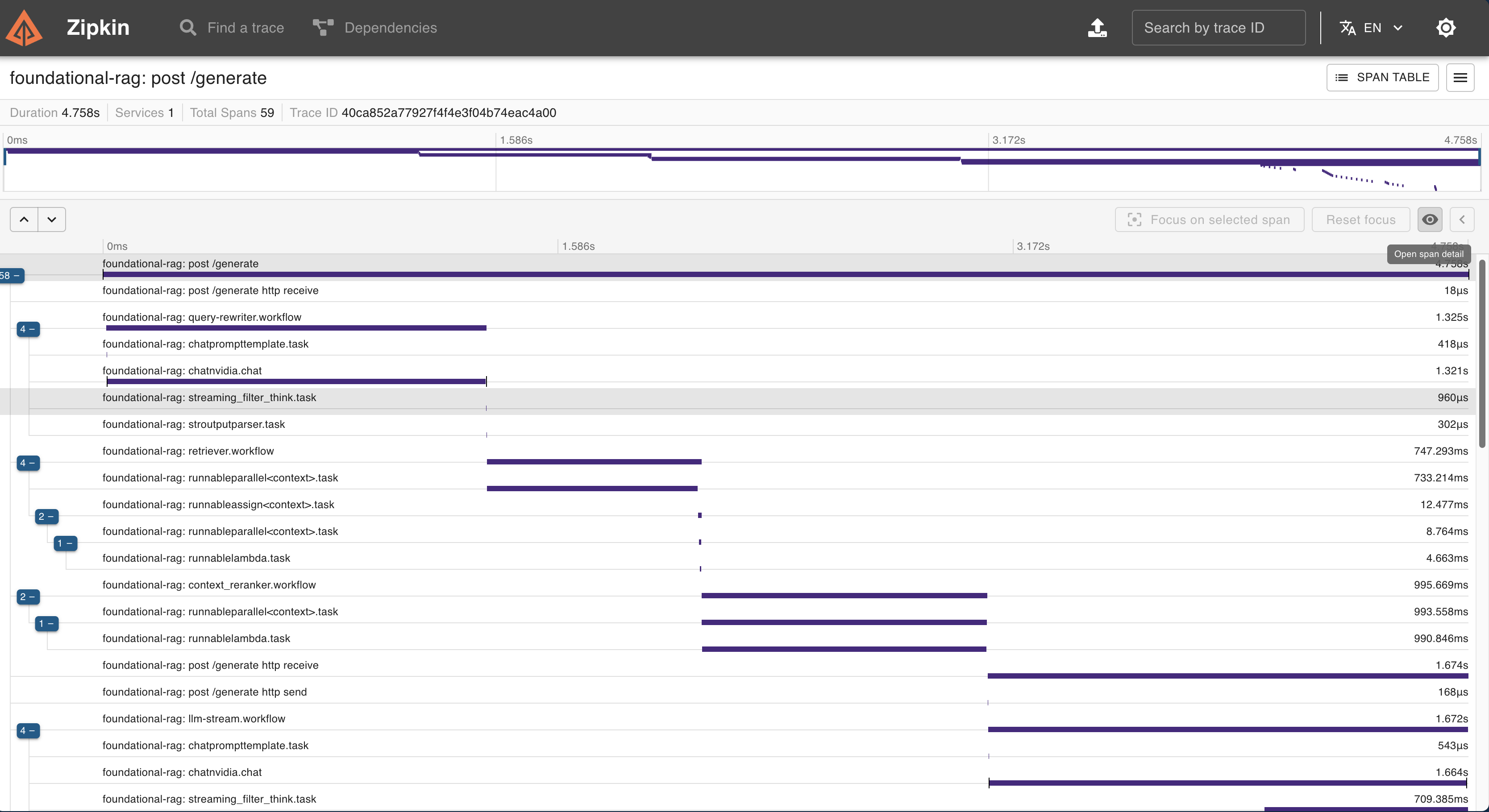 After tracing is enabled and running, you can view inputs and outputs of different stages of the RAG pipeline in Zipkin.