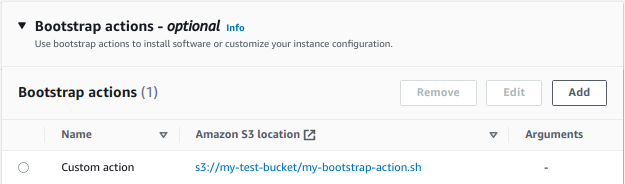 9--bootstrap-actions Name='Setup cgroups bootstrap',Path=s3://demo-bucket/cgroup-bootstrap-action.sh