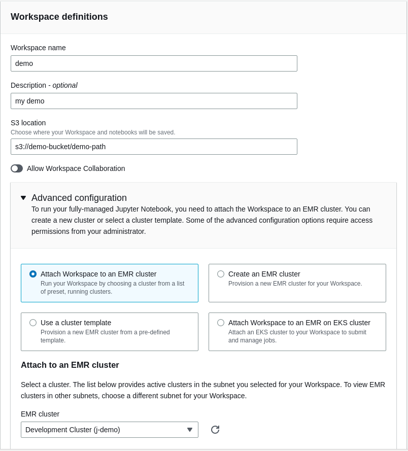 Enter a Workspace name, description and a location (which should be set by default to the studio S3 path). Under “Advanced configuration”, you can pick an EMR cluster that you have already launched.