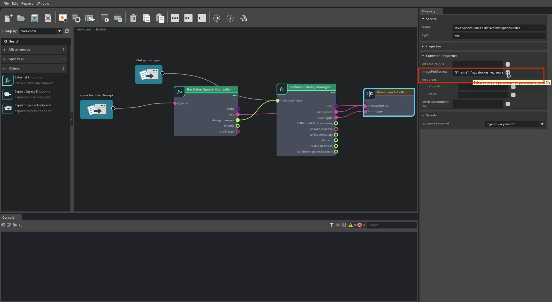 grpc-apiingress endpoint. Rename the component.speech-controller-apiand connect it to thegrpc-apiendpoint. This will export the BotMaker Speech Controllergrpc-apiasspeech-controller-apiin the new exported microservice. Do the same for the BotMaker Dialog Managerdialog-manageringress endpoint.