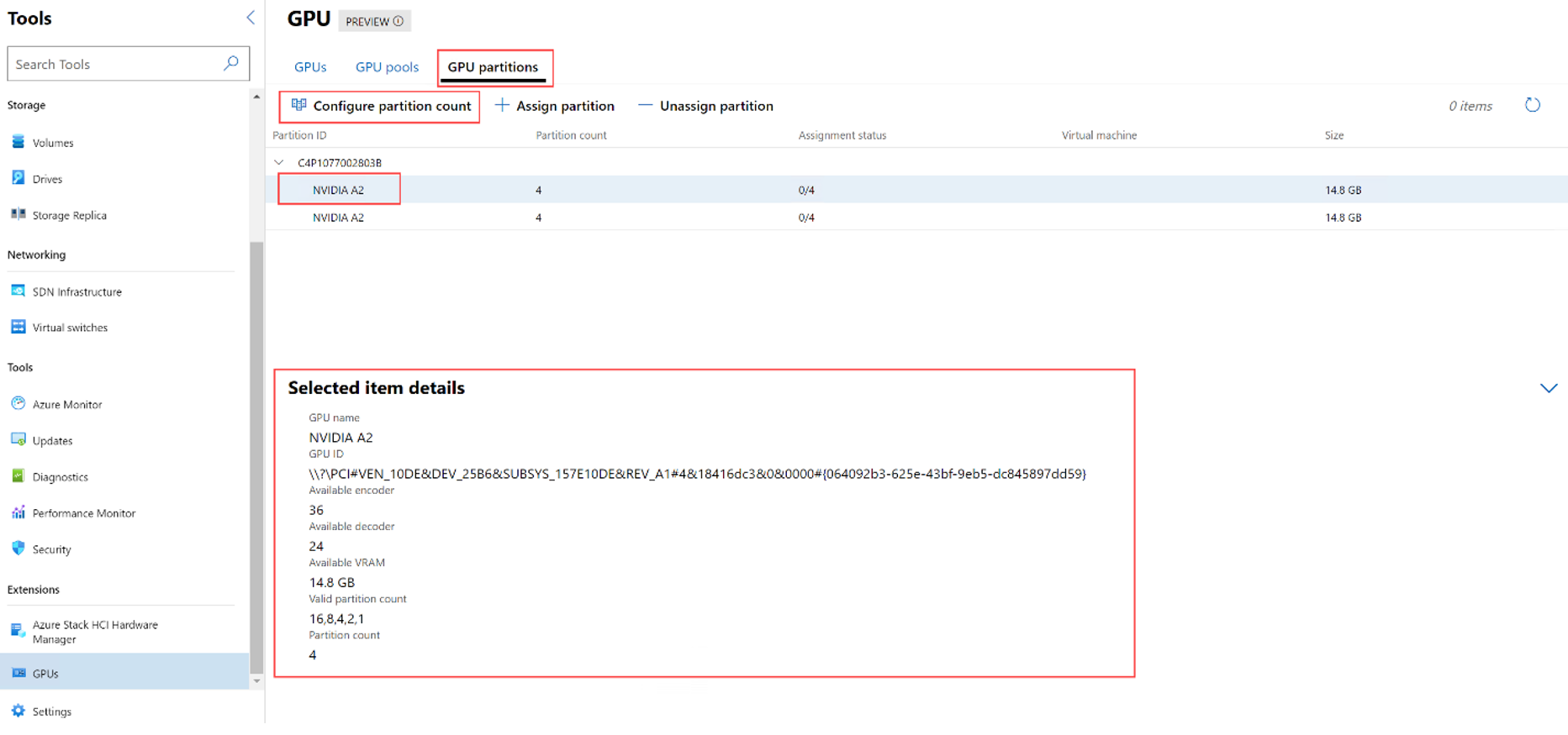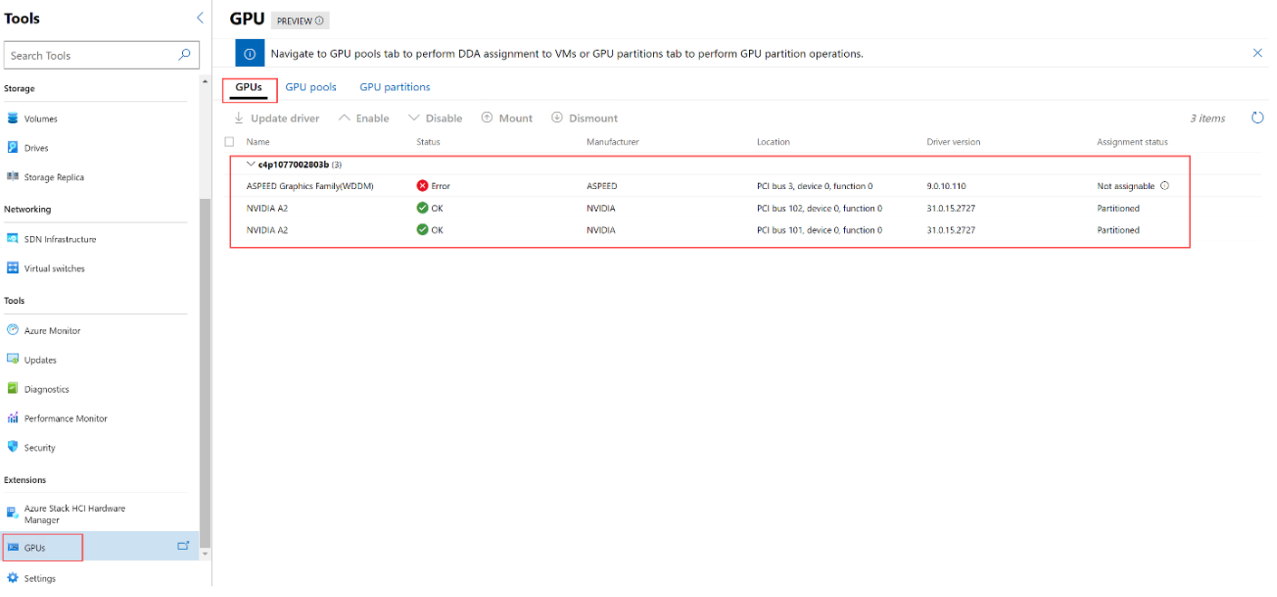 Make sure to install the GPU drivers on every server of the cluster. For more information, see NVIDIA vGPU documentation. Follow these steps to verify if the GPU driver is installed and partitionable using Windows Admin Center: