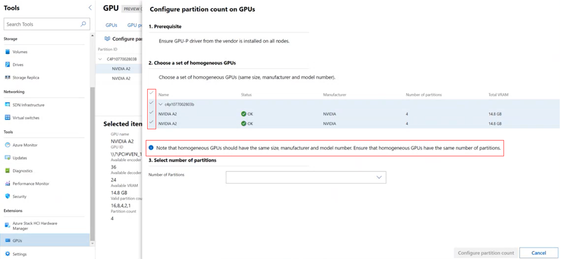Select a set of homogeneous GPUs. By default, Windows Admin Center automatically selects a set of homogenous GPUs if it detects one, as shown in the following screenshot: