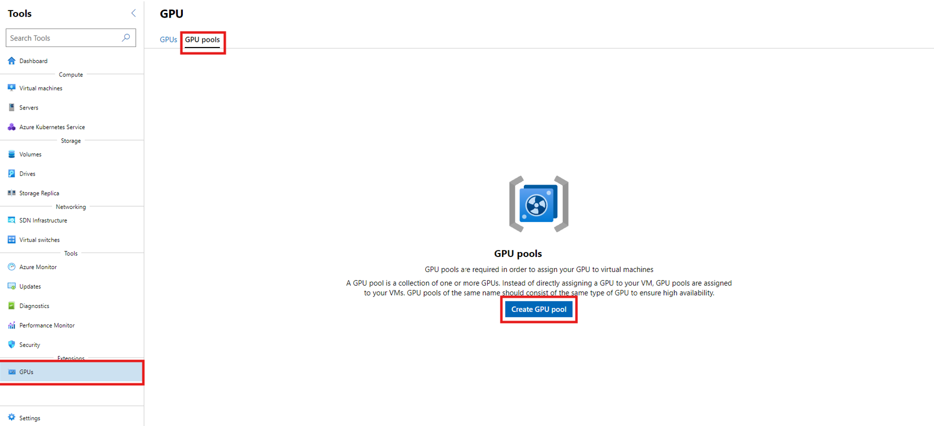 On the tool’s main page, select the GPU pools tab, and then select Create GPU pool.