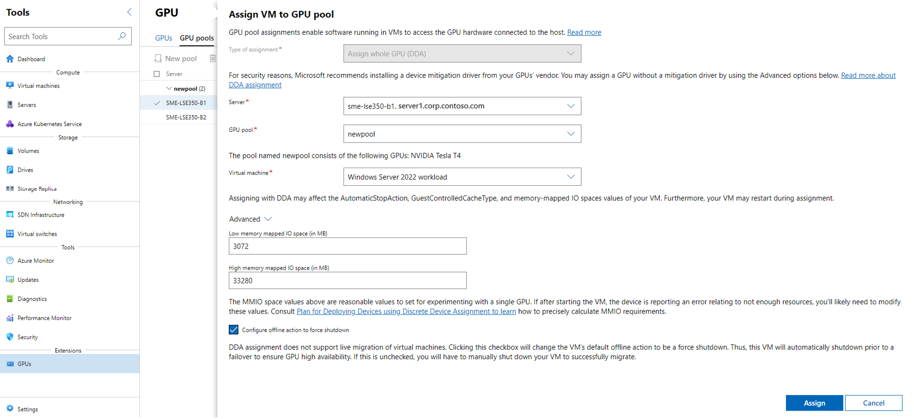 On the Assign VM to GPU pool page, specify the following and then select Assign: